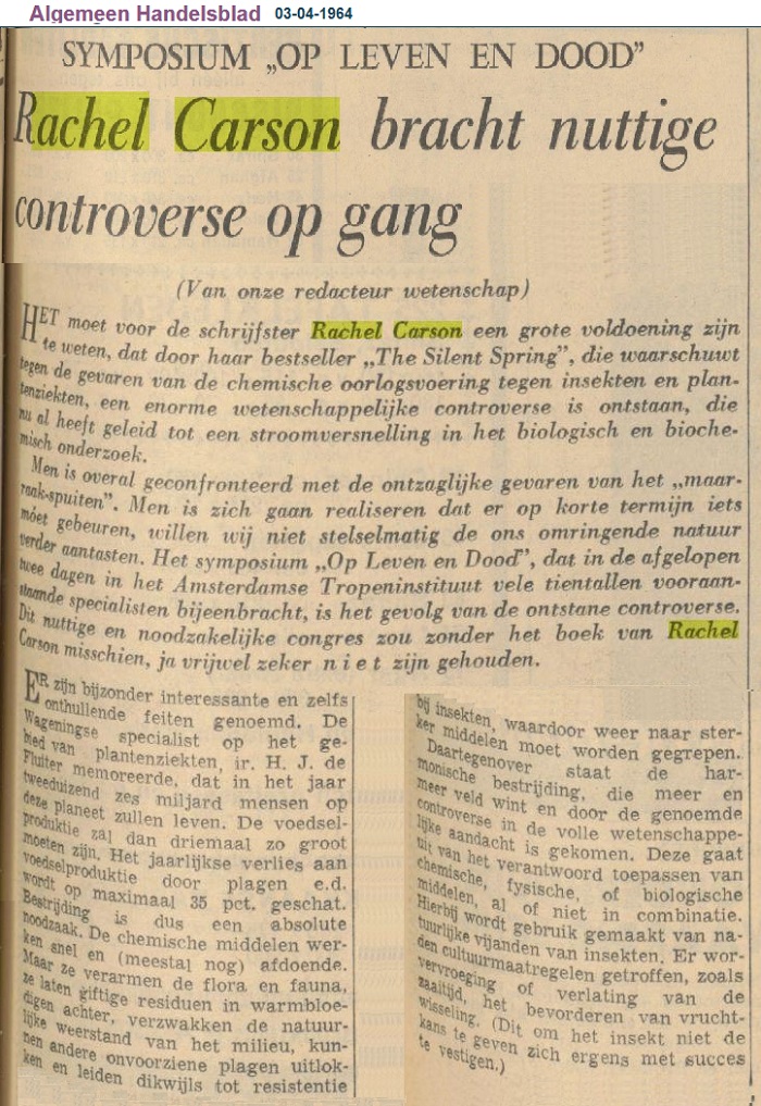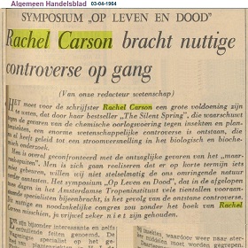 "SYMPOSIUM „OP LEVEN EN DOOD" Rachel Carson bracht nuttige controverse op gang". "Algemeen Handelsblad". Amsterdam, 03-04-1964. Geraadpleegd op Delpher op 01-09-2019, https://resolver.kb.nl/resolve?urn=KBNRC01:000033792:mpeg21:a0133
