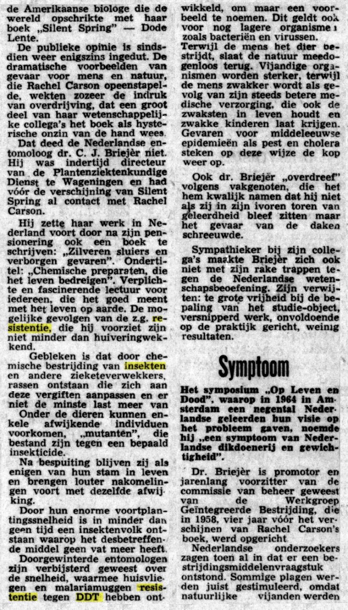 Dat deed de Nederlandse entomoloog dr. C. J. Briejèr niet. Hij was indertijd directeur van de Plantenziektenkundige Dienst te Wageningen en had vóór de verschijning van Silent Spring al contact met Rachel Carson.