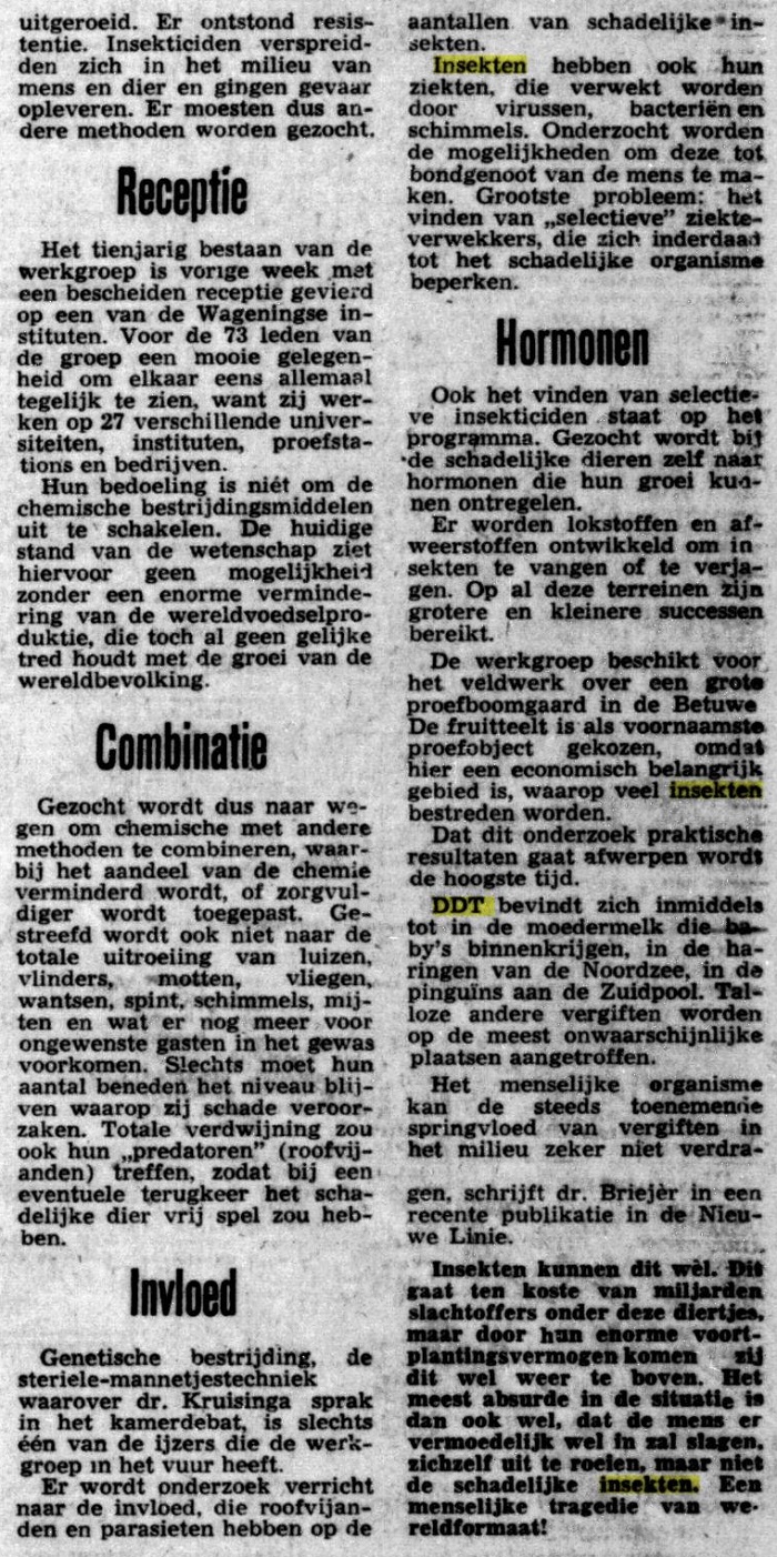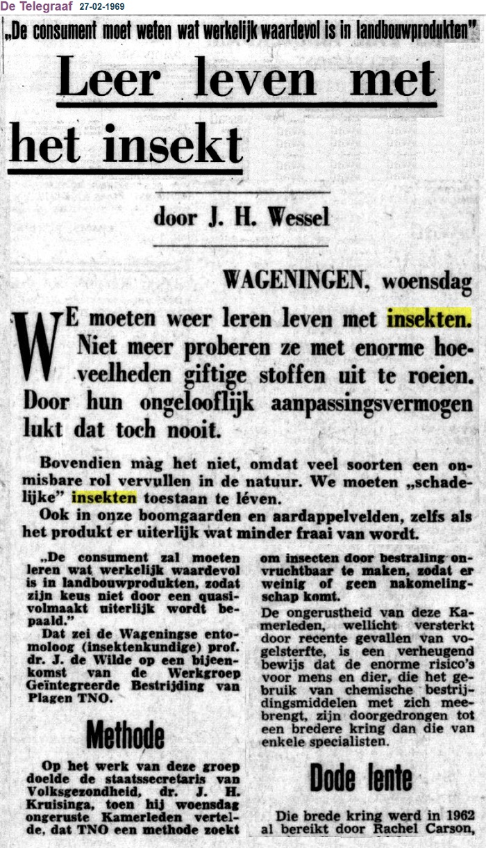 Dat zei de Wageningse entomoloog (insektenkundige) prof. dr. J. de Wilde op een bijeenkomst van de Werkgroep Geïntegreerde Bestrijding van Plagen TNO.