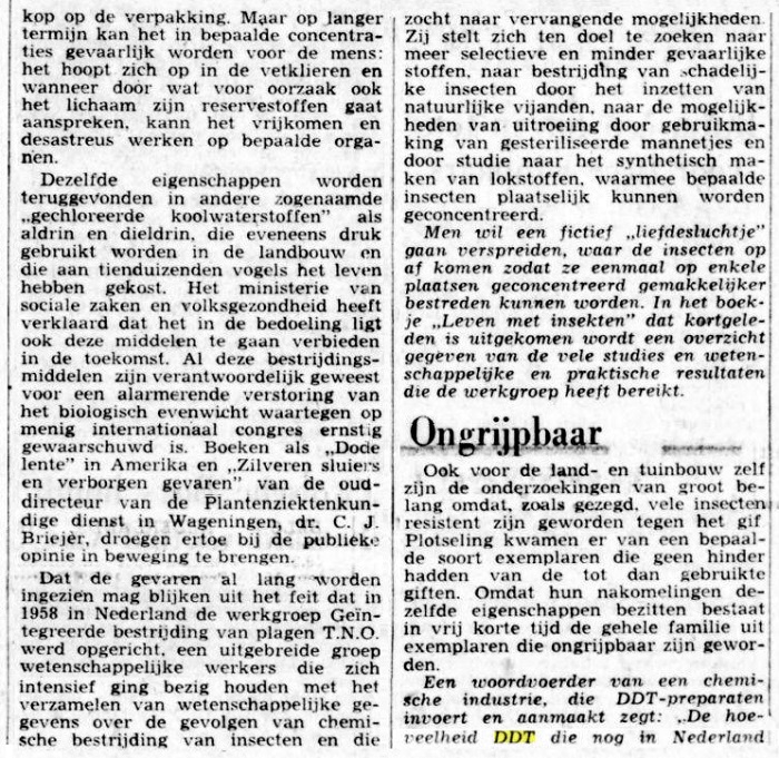Dezelfde eigenschappen worden teruggevonden in andere zogenaamde „gechloreerde koolwaterstoffen” als aldrin en dieldrin, die eveneens druk gebruikt worden in de landbouw en die aan tienduizenden vogels het leven hebben gekost. Het ministerie van sociale zaken en volksgezondheid heeft verklaard dat het in de bedoeling ligt ook deze middelen te gaan verbieden in de toekomst. Al deze bestrijdingsmiddelen zijn verantwoordelijk geweest voor een alarmerende verstoring van het biologisch evenwicht waartegen op menig internationaal congres ernstig gewaarschuwd is. Boeken als „Dode lente” in Amerika en „Zilveren sluiers en verborgen gevaren” van de oud-directeur van de Plantenziektenkundige Dienst in Wageningen, dr. C. J. Briejèr, droegen ertoe bij de publieke opinie in beweging te brengen.