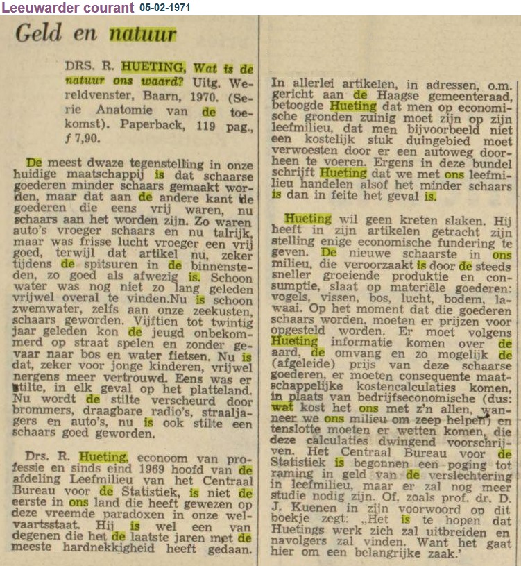 In eerdere publicaties wees dr. Hueting op het feit dat de economisch-technologische ontwikkeling van de laatste decennia schaarse goederen minder schaars, maar ook vrije goederen (zuivere lucht. schoon water, stilte) steeds minder vrij maakt.