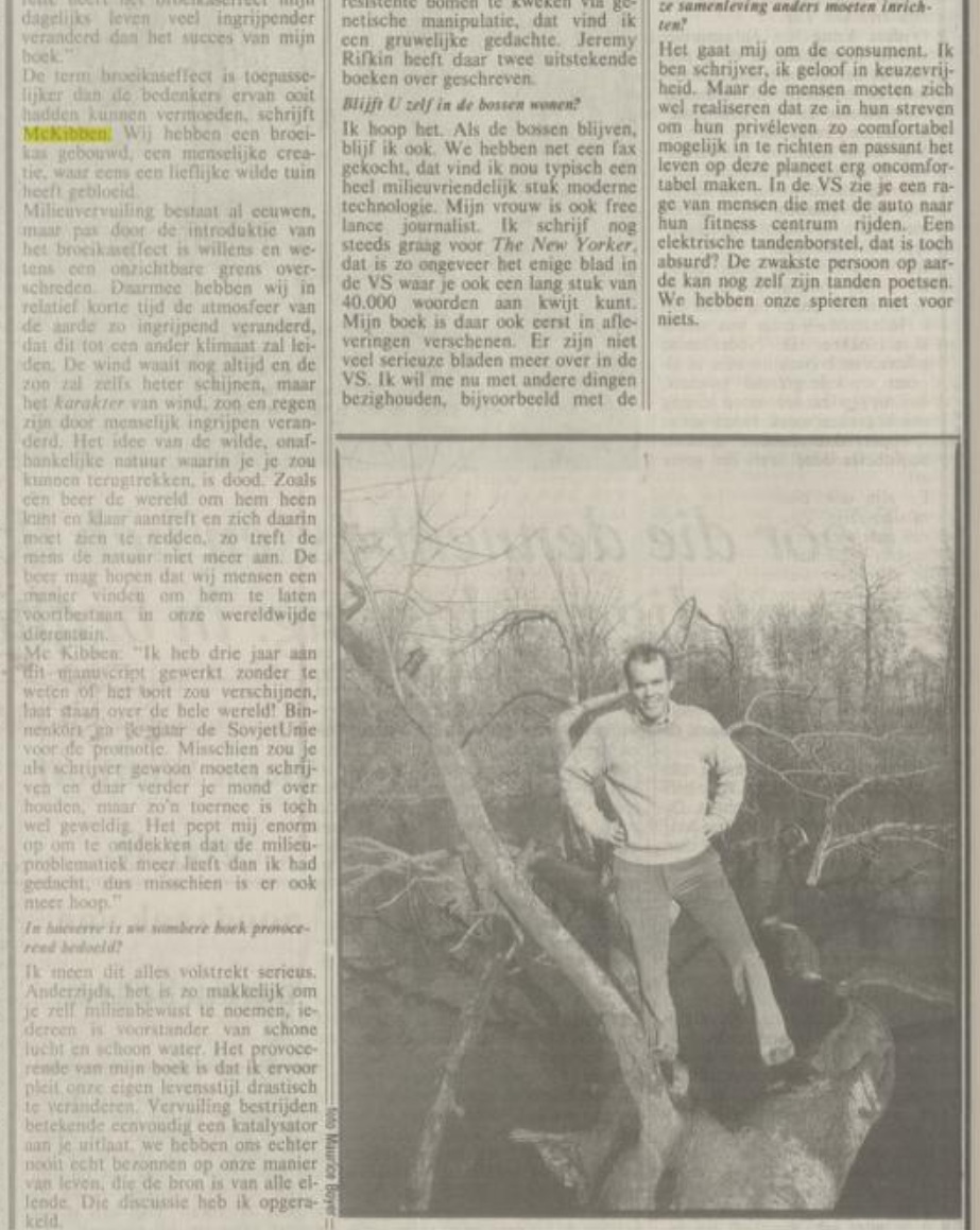 Mc Kibben: "Ik heb drie jaar aan dit manucript gewerkt zonder te weten of het ooit zou verschijnen, laat staan over de hele wereld! Binnenkort ga ik naar de SovjetUnie voor de promotie. Misschien zou je als schrijver gewoon moeten schrijven en daar verder je mond over houden, maar zo'n toernee is toch wel geweldig. Het pept mij enorm op om te ontdekken dat de milieuproblematiek meer leeft dan ik had gedacht, dus misschien is er ook meer hoop."