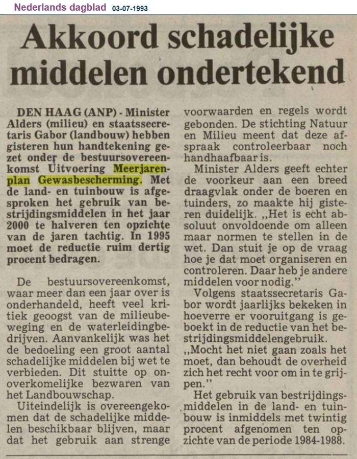 "Akkoord schadelijke middelen ondertekend". "Nederlands dagblad : gereformeerd gezinsblad / hoofdred. P. Jongeling ... [et al.]". Amersfoort, 03-07-1993. Geraadpleegd op Delpher op 28-06-2019, https://resolver.kb.nl/resolve?urn=ddd:010628627:mpeg21:a0220