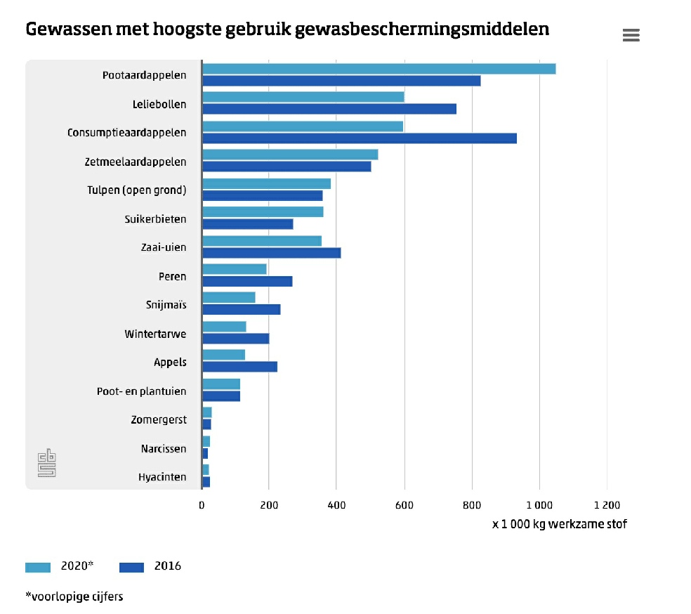 We zijn op onderzoek uitgegaan. CBS meldt dat er minder ‘gewasbescherming’ gebruikt wordt. Waarbij gewasbescherming een vreemd woord is, want je beschermt het ene en doodt het andere: daar is het gif immers voor bedoeld. En minder dan veel, kan nog steeds veel zijn. Vergelijk dit: iemand eet 4000 calorieën per dag. Hij mindert tot 3000. Maar bij 2000 val je pas af. Dan zal deze persoon nog steeds blijven groeien.