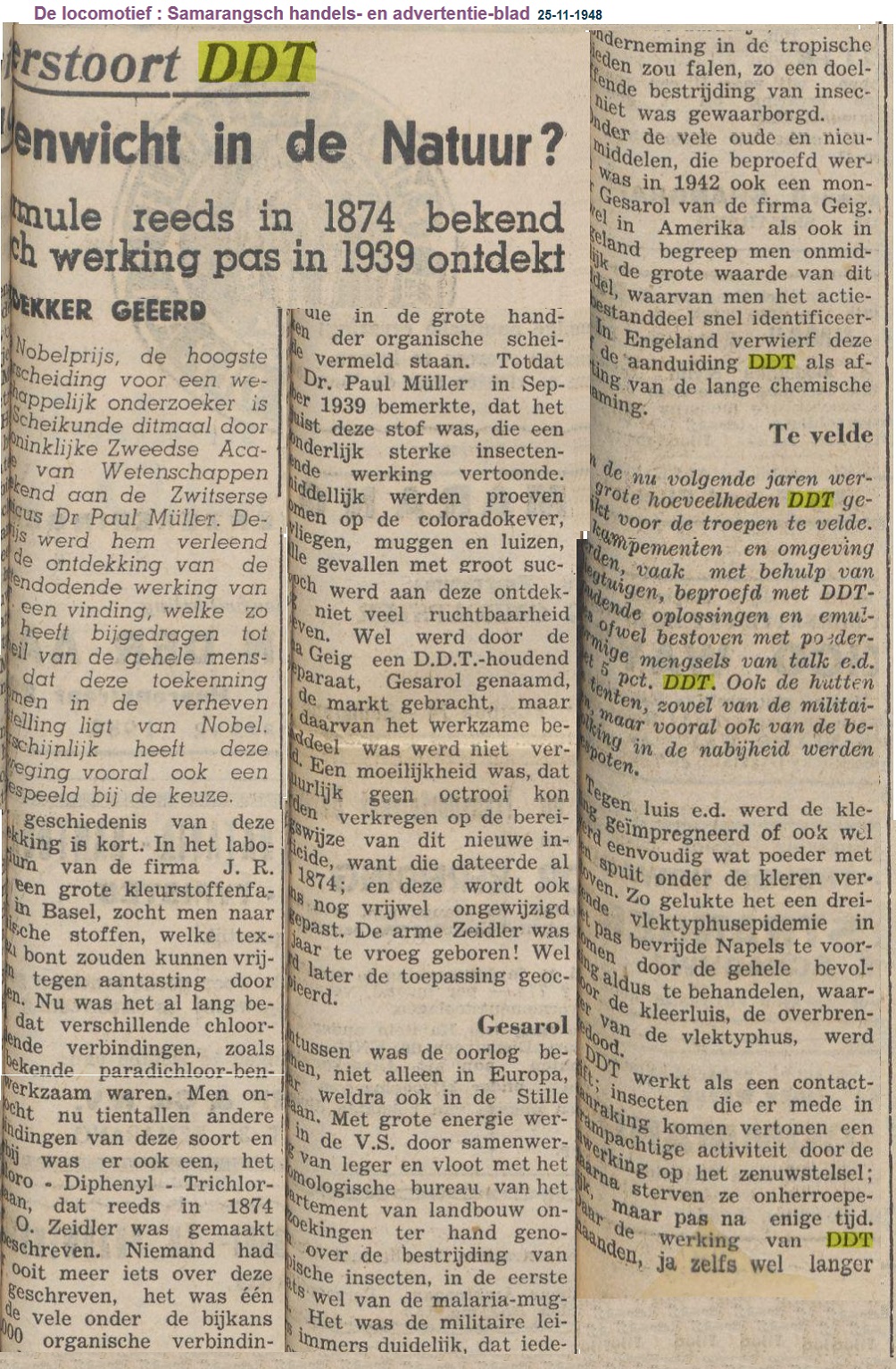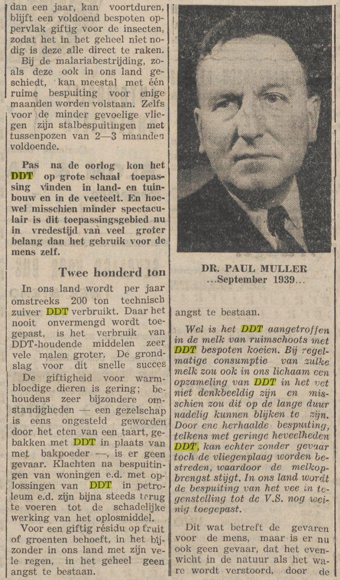 De Nobelprijs, de hoogste onderscheiding voor een wetenschappelijk onderzoeker is voor scheikunde ditmaal door Zweedse Academie van Wetenschappen toegekend aan de Zwitserse academicus Dr. Paul Müller. Deze prijs werd hem verleend voor de ontdekking van de insectendodende werking van DDT een vinding, welke zo veel heeft bijgedragen tot het heil van de gehele mensheid, dat deze toekenning volkomen in de verheven doelstelling ligt van Nobel.