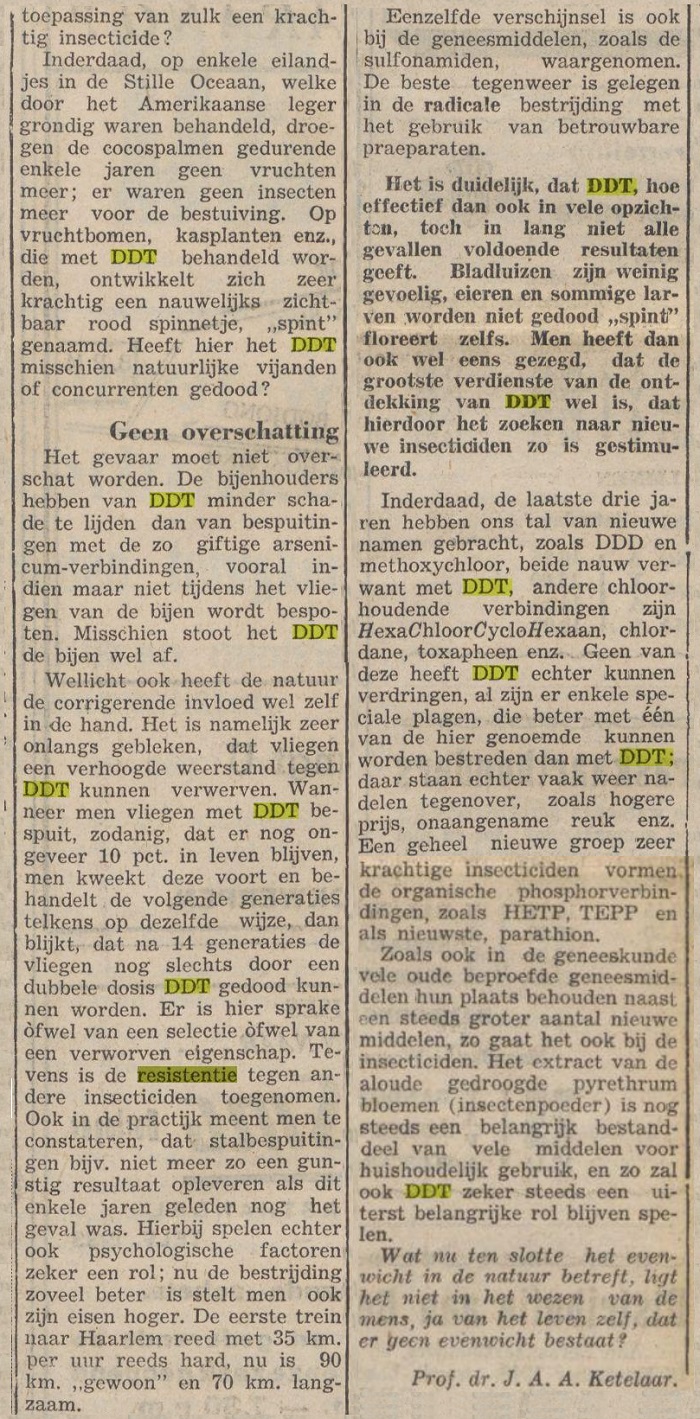 Wellicht ook heeft de natuur de corrigerende invloed wel zelf in de hand. Het is namelijk zeer onlangs gebleken, dat vliegen een verhoogde weerstand tegen DDT kunnen verwerven. Wanneer men vliegen met DDT bespuit, zodanig, dat er nog ongeveer 10 pct. in leven blijven, men kweekt deze voort en behandelt de volgende generaties telkens op dezelfde wijze, dan blijkt, dat na 14 generaties de vliegen nog slechts door een dubbele dosis DDT gedood kunnen worden. Er is hier sprake ófwel van een selectie ófwel van een verworven eigenschap.