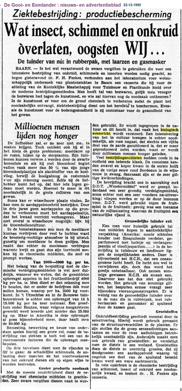 BAARN. — Is het wel verantwoord de zware vergiften te gebruiken die voor een intensieve bestrijding van onkruid, schimmels en insecten worden nodig geacht, zo begon gisteravond dr. F. H. Feekes, verbonden aan het laboratorium voor wetenschappelijk onderzoek van plantenziekten te Baarn een causerie die hij voor de afdeling van de Koninklijke Maatschappij voor Tuinbouw en Plantkunde hield over de moderne bestrijdingsmethodes.
