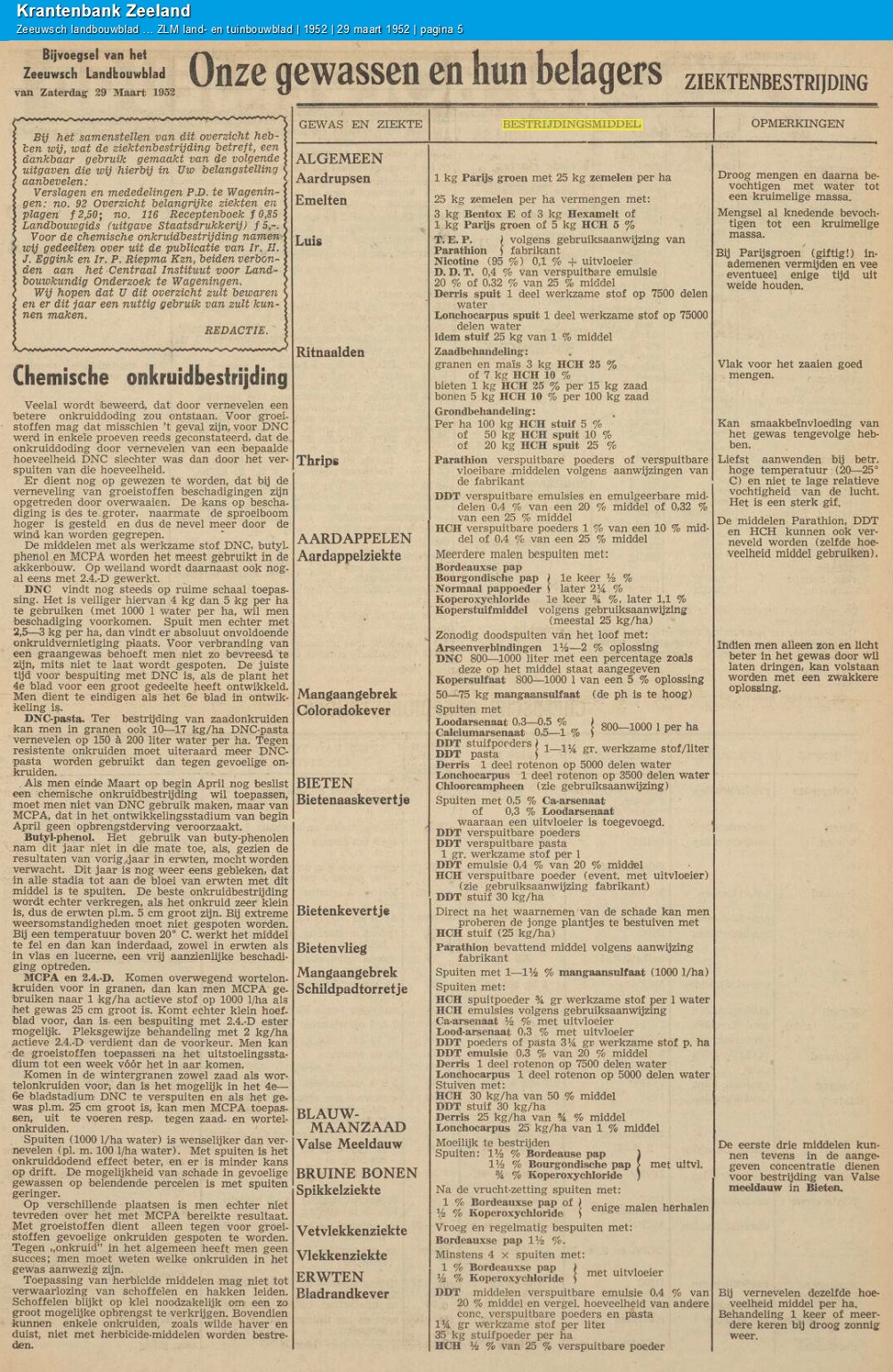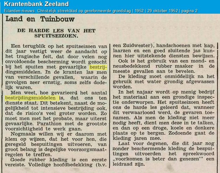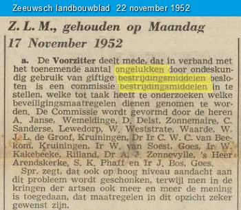In het Zeeuws Landbouwblad (orgaan van de Zeeuwsche Landbouw Maatschappij - Z.L.M.) is te lezen dat tijdens de vergadering van 17 november 1952 werd medegedeelt, dat er een commissie bestrijdinsmiddelen was ingesteld. Dit in verband met het grote aantal ongelukken door ondeskundig gebruik van giftige bestrijdingsmiddelen.