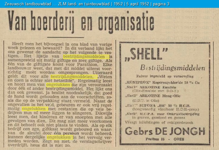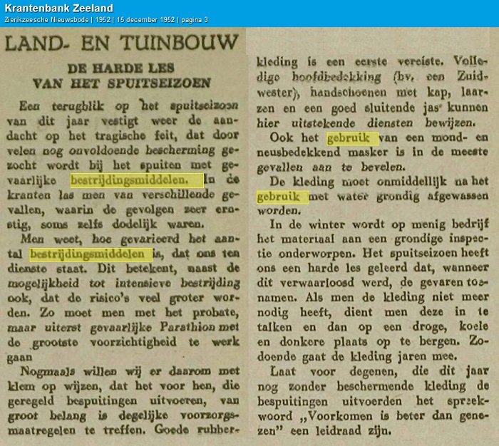 De Zeeuwsche Couranten - via Krantenbank Zeeland - waren de eerste met enkele verontrustte berichten over het grote aantal ernstige ongelukken bij het gebruik van landbouwgif.
