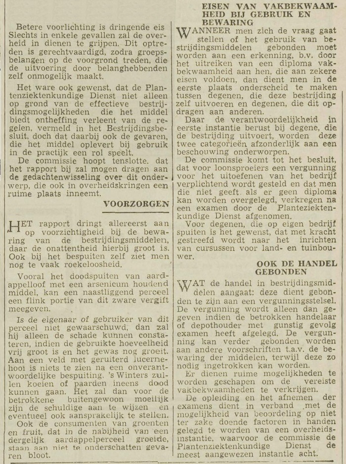 HET rapport dringt allereerst aan op voorzichtigheid bij de bewaring van de bestrijdingsmiddelen, daar de onattentheid hierbij groot is. Ook bij het bespuiten zelf ziet men nog te vaak roekeloosheid.