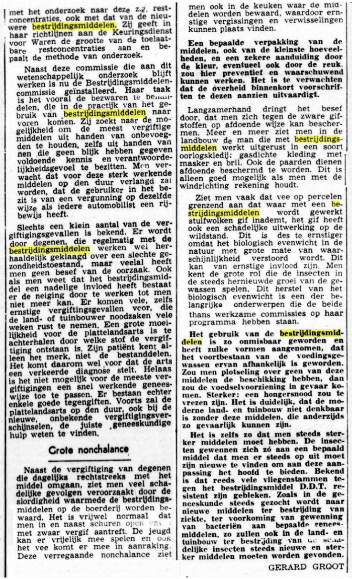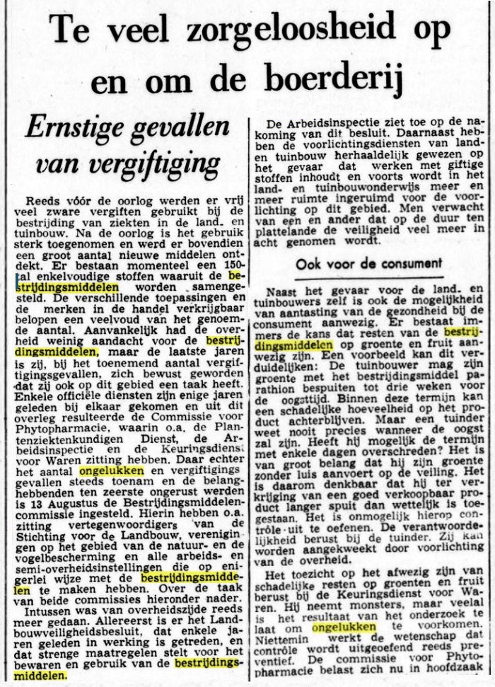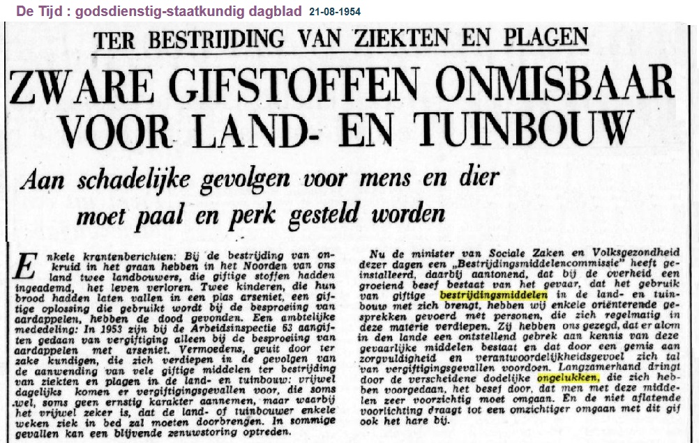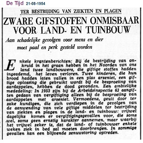 Een ambtelijke mededeling: In 1953 zijn bij de Arbeidsinspectie 63 aangiften gedaan van vergiftiging alleen bij de besproeiing van aardappelen met arseniet. Vermoedens, geuit door ter zake kundigen, die zich verdiepen in de gevolgen van de aanwending van vele giftige middelen ter bestrijding van ziekten en plagen in de land- en tuinbouw: vrijwel dagelijks komen er vergiftigingsgevallen voor, die soms wel, soms geen ernstig karakter aannemen, maar waarbij het vrijwel zeker is, dat de land- of tuinbouwer enkele weken ziek in bed zal moeten doorbrengen. In sommige gevallen kan een blijvende zenuwstoring optreden.