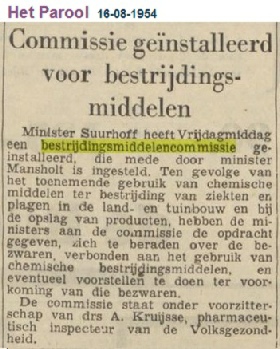 Enkele officiële diensten zijn enige jaren geleden bij elkaar gekomen en uit dit overleg resulteerde de Commissie voor Phytopharmacie, waarin o.a. de Plantenziektenkundigen Dienst, de Arbeidsinspectie en de Keuringsdienst voor Waren zitting hebben. Daar echter het aantal ongelukken en vergiftigingsgevallen steeds toenam en de belanghebbenden ten zeerste ongerust werden is 13 Augustus de Bestrijdingsmiddelencommissie ingesteld.