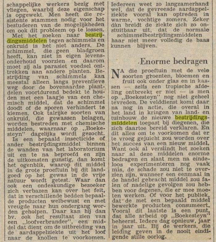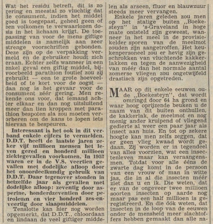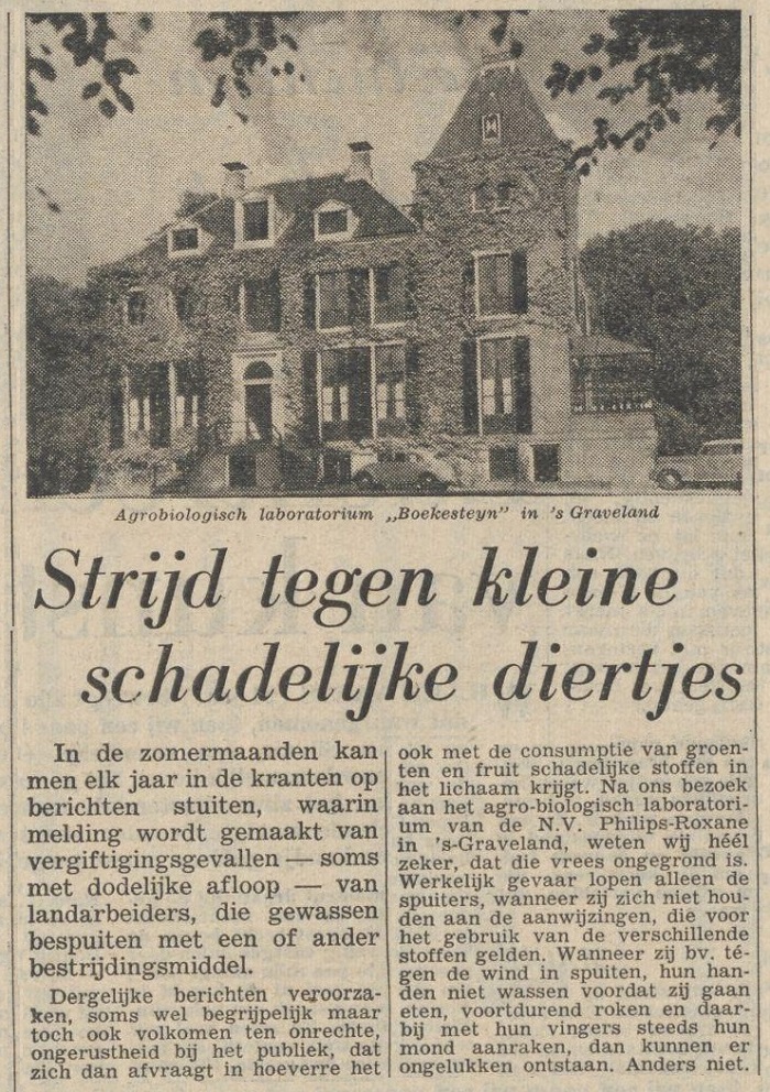 Na ons bezoek aan het agro-biologisch laboratorium van de N.V. Philips-Roxane in 's-Graveland, weten wij héél zeker, dat die vrees ongegrond is. Werkelijk gevaar lopen alleen de spuiters, wanneer zij zich niet houden aan de aanwijzingen, die voor het gebruik van de verschillende stoffen gelden. Wanneer zij bv. tégen de wind in spuiten, hun handen niet wassen voordat zij gaan eten, voortdurend roken en daarbij met hun vingers steeds hun mond aanraken, dan kunnen er ongelukken ontstaan. Anders niet.