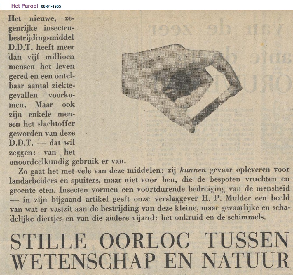 Het nieuwe, zegenrijke insectenbestrijdingsmiddel D.D.T. heeft meer dan vijf miljoen mensen het leven gered en een ontelbaar aantal ziektegevallen voorkomen. Maar ook zijn enkele mensen het slachtoffer geworden van deze D.D.T. — dat wil zeggen: van het onoordeelkundig gebruik er van.