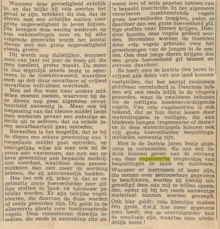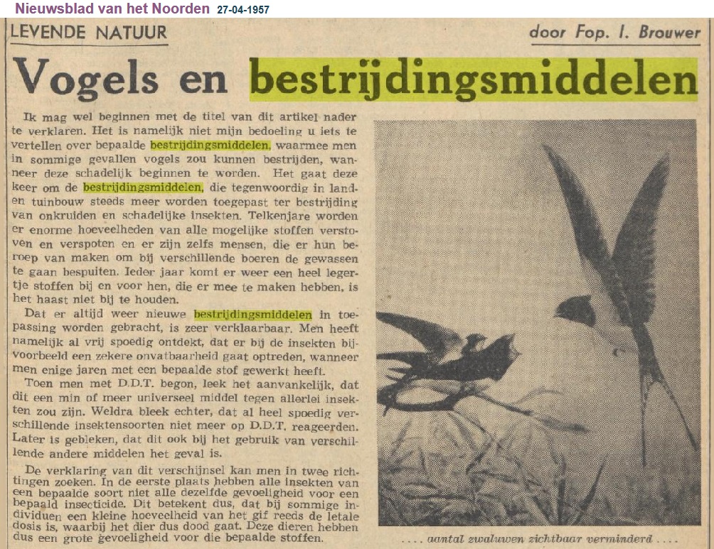 "LEVENDE NATUUR door Fop. I. Brouwer Vogels en bestrijdingsmiddelen". "Nieuwsblad van het Noorden". Groningen, 1957/04/27 http://resolver.kb.nl/resolve?urn=ddd:010677122:mpeg21:p017