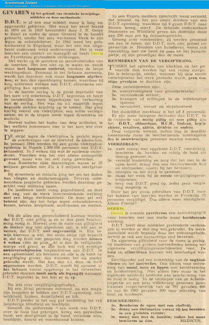 Iemand, die gedurende ± een week wat DDT. over de huid had gekregen, kreeg een gezwollen hand, een doof gevoel in de hand, verlamde arm, hoofdpijn, koorts en voortdurend braken.