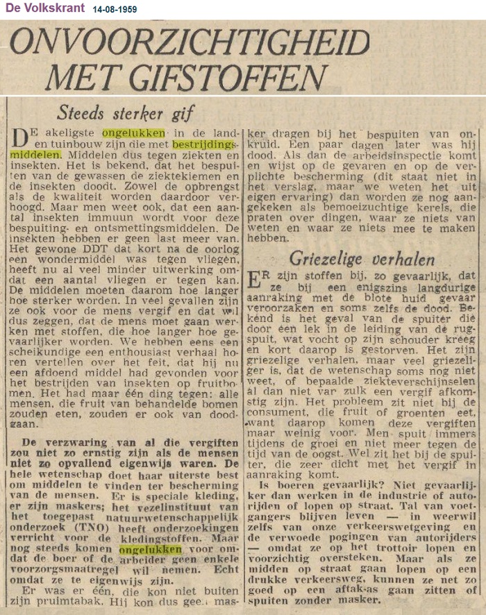 ER zijn stoffen bij, zo gevaarlijk, dat ze bij een enigszins langdurige aanraking met de blote huid gevaar veroorzaken en soms zelfs de dood. Bekend is het geval van de spuiter die door een lek in de leiding van de rugspuit, wat vocht op zijn schouder kreeg en kort daarop is gestorven. Het zijn griezelige verhalen, maar veel griezeliger is, dat de wetenschap soms nog niet weet, of bepaalde ziekteverschijnselen al dan niet van zulk een vergif afkomstig zijn. Het probleem zit niet bij de consument, die fruit of groenten eet, want daarop komen deze vergiften maar weinig voor. Men spuit immers tijdens de groei en niet meer tegen de tijd van de oogst. Wel zit het bij de spuiter, die zeer dicht met het vergif in aanraking komt.