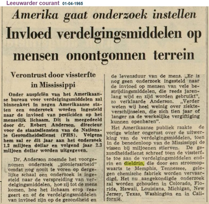 "Amerika gaat onderzoek instellen Invloed verdelgingsmiddelen op mensen onontgonnen terrein Verontrust door vissterfte in Mississippi". "Leeuwarder courant : hoofdblad van Friesland". Leeuwarden, 1965/04/01 00:00:00, p. 13. Geraadpleegd op Delpher op 06-10-2019, http://resolver.kb.nl/resolve?urn=ddd:010617117:mpeg21:p013