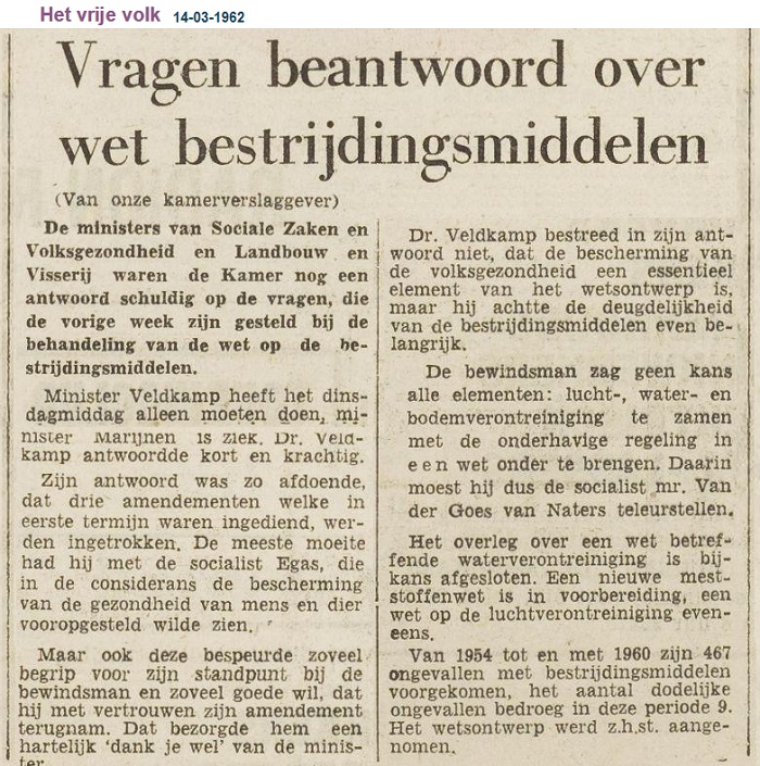 Het overleg met de minister van verkeer en waterstaat over een wetsontwerp op de waterverontreiniging is thans bijkans afgesloten. Inmiddels is ook de voorbereiding van een nieuwe meststoffenwet ter hand genomen. De bewindsman noemde verder maatregelen op korte termijn gewenst daar, waar verontreiniging van de bodem door vergiften in het bijzonder gevaar kan opleveren, namelijk in waterwingebieden. Dr. Veldkamp noopte dit onderwerp op korte termijn afzonderlijk in beschouwing te nemen.