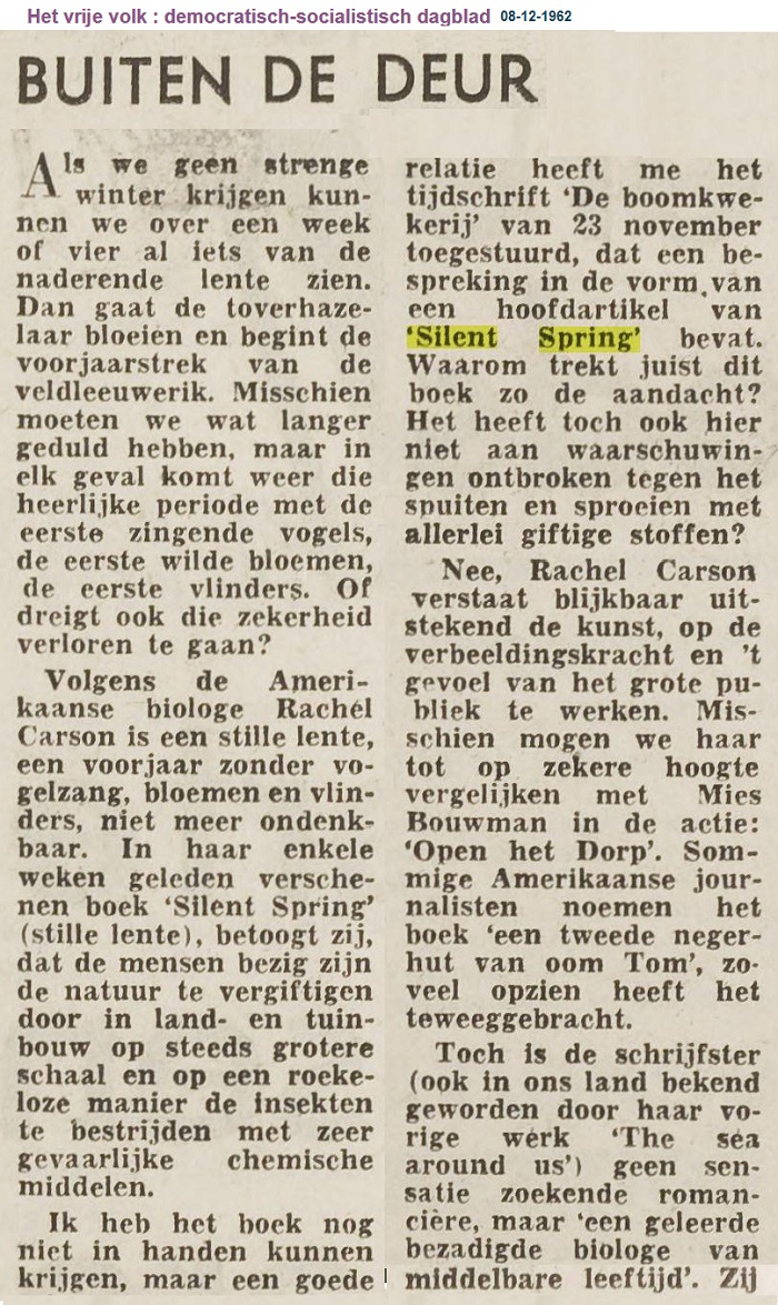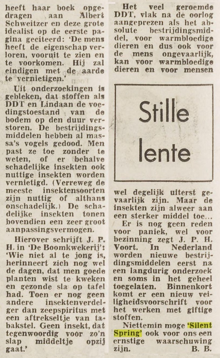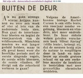 Volgens de Amerikaanse biologe Rachel Carson is een stille lente, een voorjaar zonder vogelzang, bloemen en vlinders, niet meer ondenkbaar. In haar enkele weken geleden verschenen boek 'Silent Spring' (stille lente), betoogt zij, dat de mensen bezig zijn de natuur te vergiftigen door in land- en tuinbouw op steeds grotere schaal en op een roekeloze manier de insekten te bestrijden met zeer gevaarlijke chemische middelen. Ik heb het boek nog niet in handen kunnen krijgen, maar een goede relatie heeft me het tijdschrift 'De boomkwekerij' van 23 november toegestuurd, dat een bespreking in de vorm,van een hoofdartikel van 'Silent Spring' bevat. Waarom trekt juist dit boek zo de aandacht? Het heeft toch ook hier niet aan waarschuwingen ontbroken tegen het spuiten en sproeien met allerlei giftige stoffen?