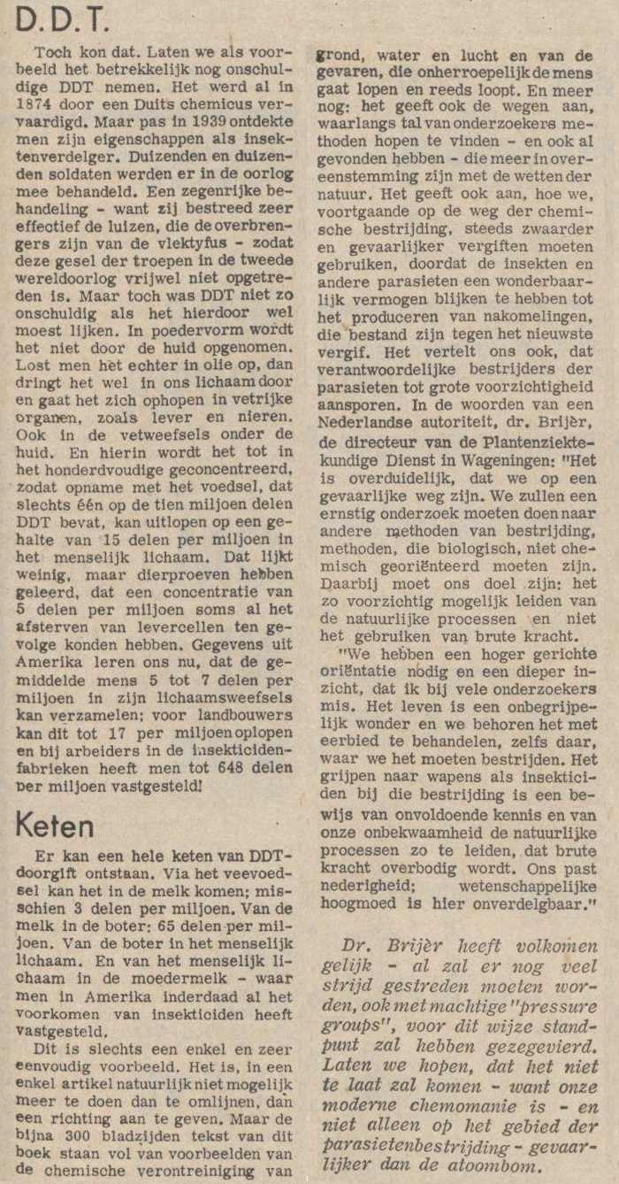 Het vertelt ons ook, dat verantwoordelijke bestrijders der parasieten tot grote voorzichtigheid aansporen. In de woorden van een Nederlandse autoriteit, dr. Briejèr, de directeur van de Plantenziektekundige Dienst in Wageningen: "Het is overduidelijk, dat we op een gevaarlijke weg zijn. We zullen een ernstig onderzoek moeten doen naar andere methoden van bestrijding, methoden, die biologisch, niet chemisch georiënteerd moeten zijn. Daarbij moet ons doel zijn; het zo voorzichtig mogelijk leiden van de natuurlijke processen en niet het gebruiken van brute kracht.