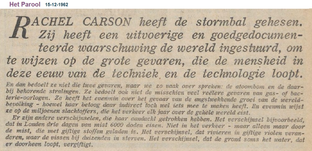 RACHEL CARSON heeft de stormbal gehesen. Zij heeft een uitvoerige en goedgedocumenteerde waarschuwing de wereld ingestuurd, om te wijzen op de grote gevaren, die de mensheid in deze eeuw van de techniek, en de technologie loopt.