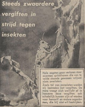 Hele oogsten gaan verloren door zwermen sprinkhanen die van te velde staande gewassen vrijwel niets overlaten. Zoals tal van parasieten worden zij bestreden met vergiften. De mens vraagt zich wellicht af in hoeverre deze vergiften ook schadelijk kunnen zijn of worden voor hemzelf en andere organismen, die hij niet wil bestrijden.