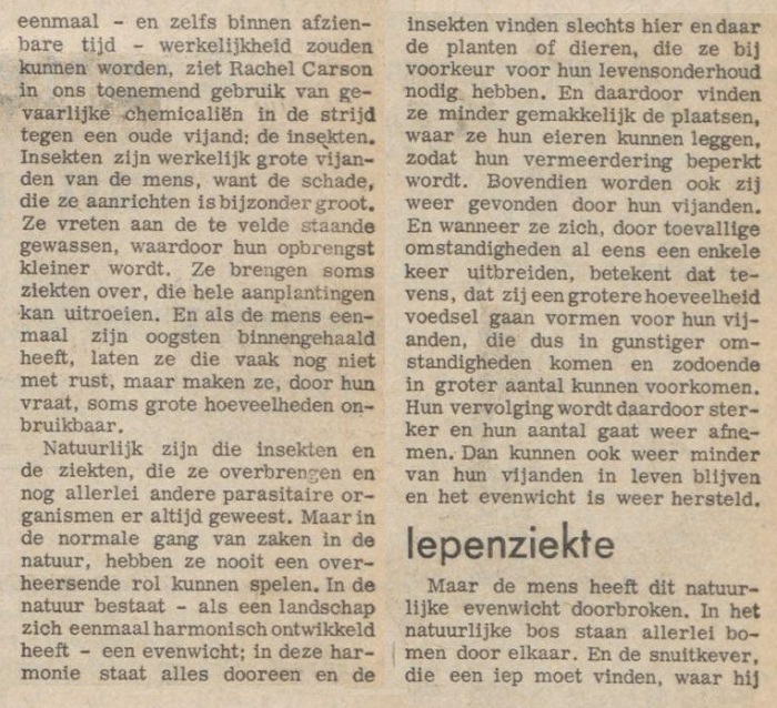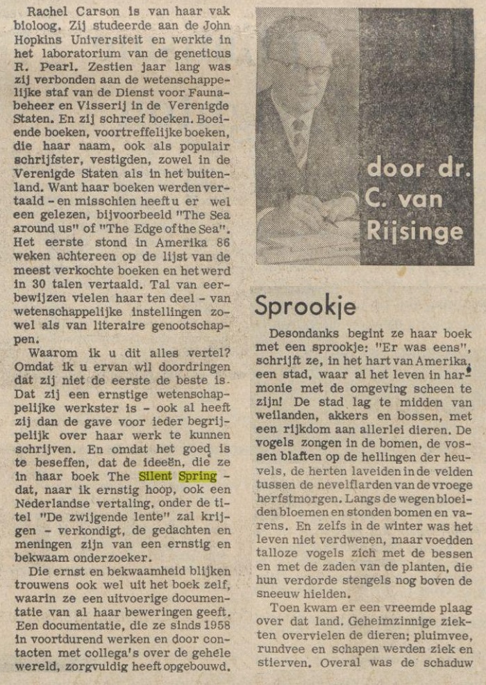 Waarom ik u dit alles vertel? Omdat ik u ervan wil doordringen dat zij niet de eerste de beste is. Dat zij een ernstige wetenschappelijke werkster is - ook al heeft zij dan de gave voor ieder begrijpelijk over haar werk te kunnen schrijven. En omdat het goed is te beseffen, dat de ideeën, die ze in haar boek The Silent Spring - dat, naar ik ernstig hoop, ook een Nederlandse vertaling, onder de titel "De zwijgende lente" zal krijgen - verkondigt, de gedachten en meningen zijn van een ernstig en bekwaam onderzoeker. Die ernst en bekwaamheid blijken trouwens ook wel uit het boek zelf, waarin ze een uitvoerige documentatie van al haar beweringen geeft. Een documentatie, die ze sinds 1958 in voortdurend werken en door contacten met collega's over de gehele wereld, zorgvuldig heeft opgebouwd.