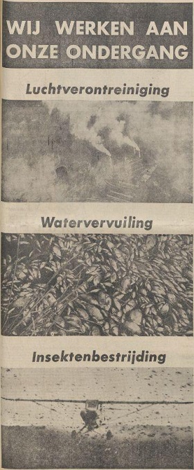 En dan bedoelt ze niet die twee gevaren, waar we zo vaak over spreken: de atoombom en de daarbij behorende stralingen. Ze bedoelt ook niet de misschien veel reëlere gevaren van gas- of bacterie- oorlogen. Ze heeft het evenmin over het gevaar van de angstwekkende groei van de wereldbevolking - hoewel haar betoog daar indirect toch wel iets mee te maken heeft. En evenmin wijst ze op de miljoenen slachtoffers, die het verkeer elk jaar over de gehele wereld eist. Er zijn andere verschijnselen, die haar aandacht getrokken hebben. Het verschijnsel bijvoorbeeld, dat in Londen drie dagen van mist 6000 doden eisen. Niet in het verkeer - maar alleen maar door de mist, die met giftige stoffen geladen is. Het verschijnsel, dat rivieren in giftige riolen veranderen, waar de vissen bij duizenden in sterven. Het verschijnsel, dat de grond soms het water, dat er doorheen loopt, vergiftigt.