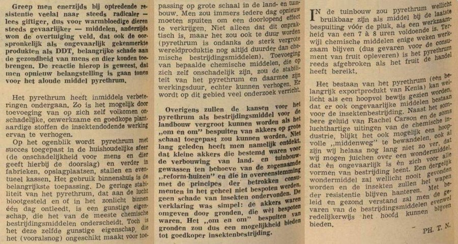 Uit de feiten van Carson blijkt echter duidelijk, dat terwijl de vogels sterven, de iepziekte zich sneller verspreidt dan vóór de D.D.T.-campagnes. In bijgaand artikel speurt de schrijver naar de waarheid (vooral de Nederlandse waarheid), die zoals gewoonlijk in het midden blijkt te liggen.