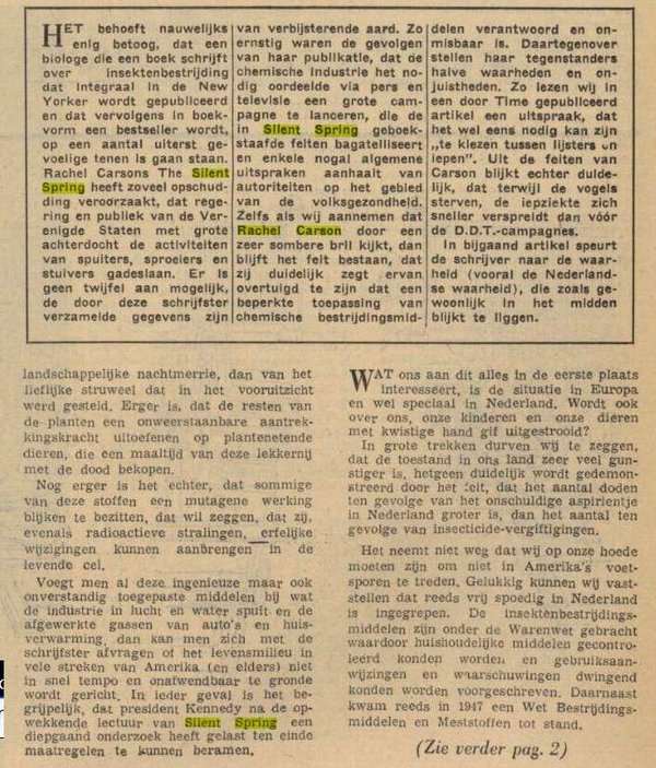 Er is geen twijfel aan mogelijk, de door deze schrijfster verzamelde gegevens zijn van verbijsterende aard. Zo ernstig waren de gevolgen van haar publicatie, dat de chemische industrie het nodig oordeelde via pers en televisie een grote campagne te lanceren, die de in Silent Spring geboekstaafde feiten bagatelliseert en enkele nogal algemene uitspraken aanhaalt van autoriteiten op het gebied van de volksgezondheid.