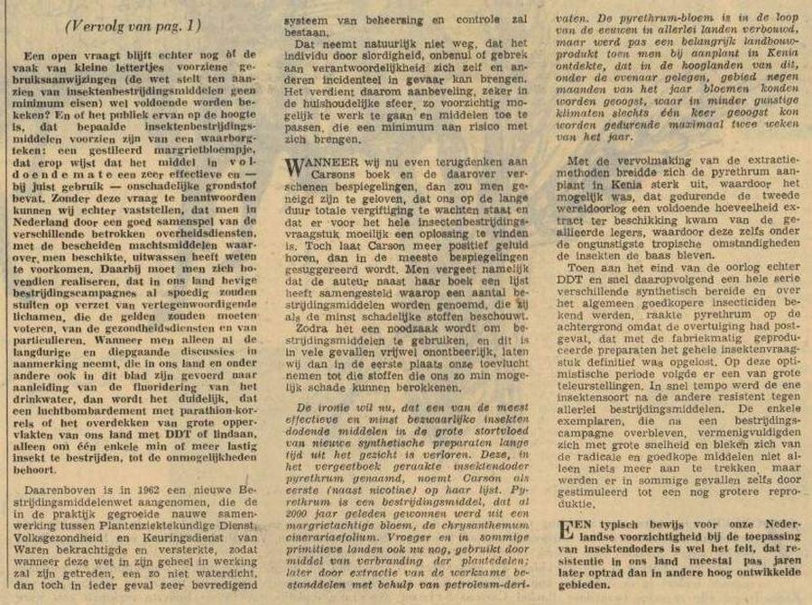 Daarenboven is in 1962 een nieuwe Bestrijdingsmiddelenwet aangenomen, die de in de praktijk gegroeide nauwe samenwerking tussen Planten-ziektekundige Dienst, Volksgezondheid en Keuringsdienst van Waren bekrachtigde en versterkte, zodat wanneer deze wet in zijn geheel in werking zal zijn getreden, een zo niet waterdicht, dan toch in ieder geval zeer bevredigend systeem van beheersing en controle zal bestaan.