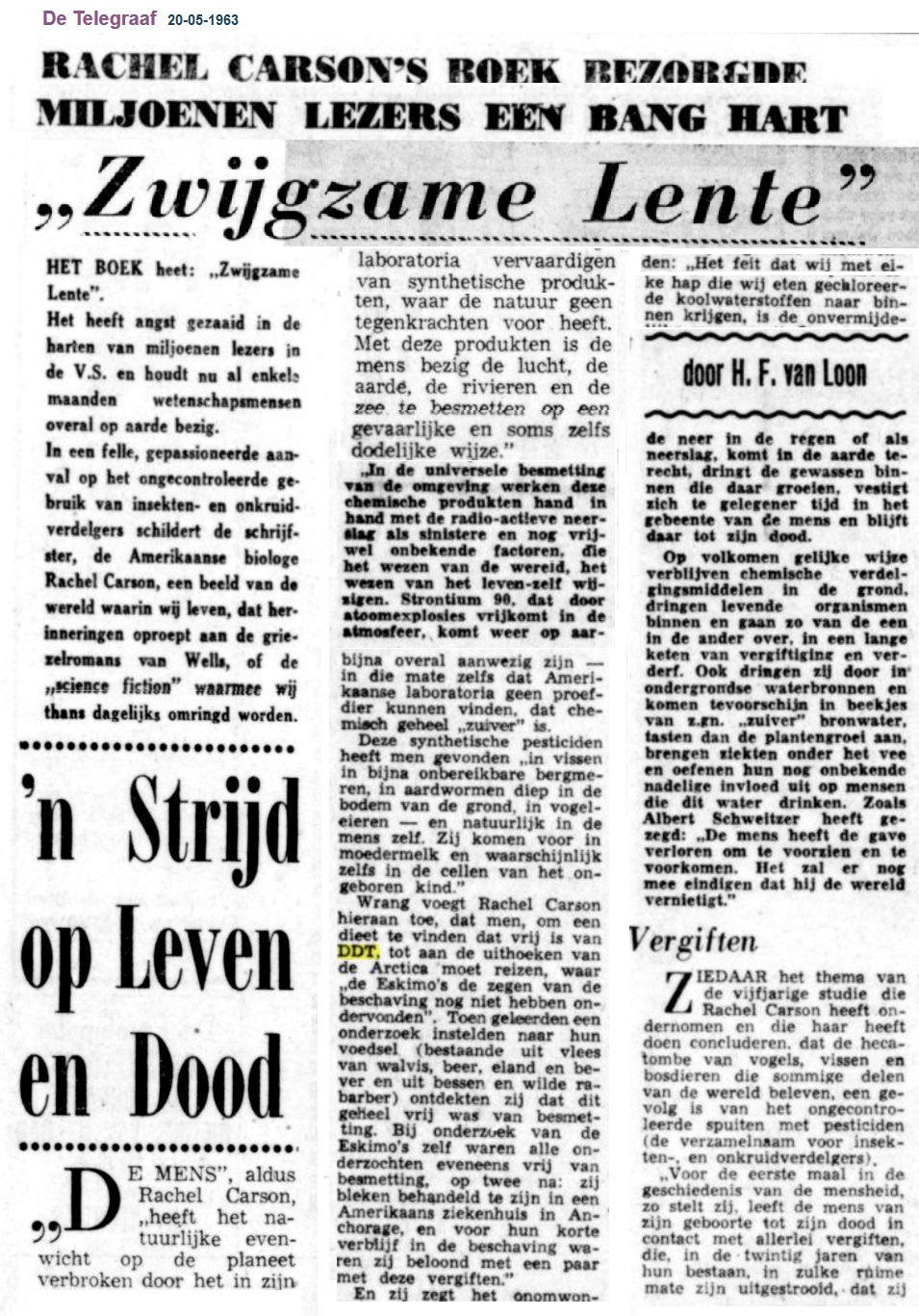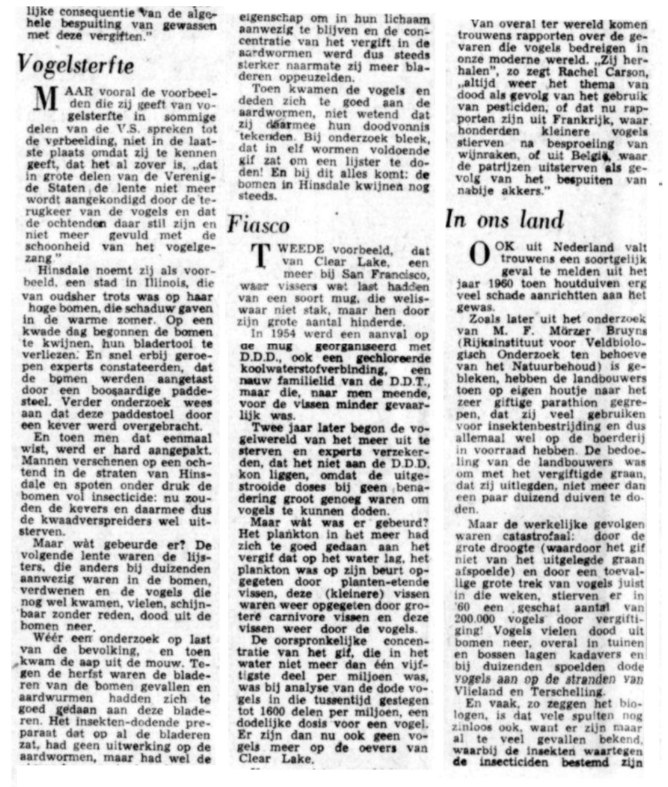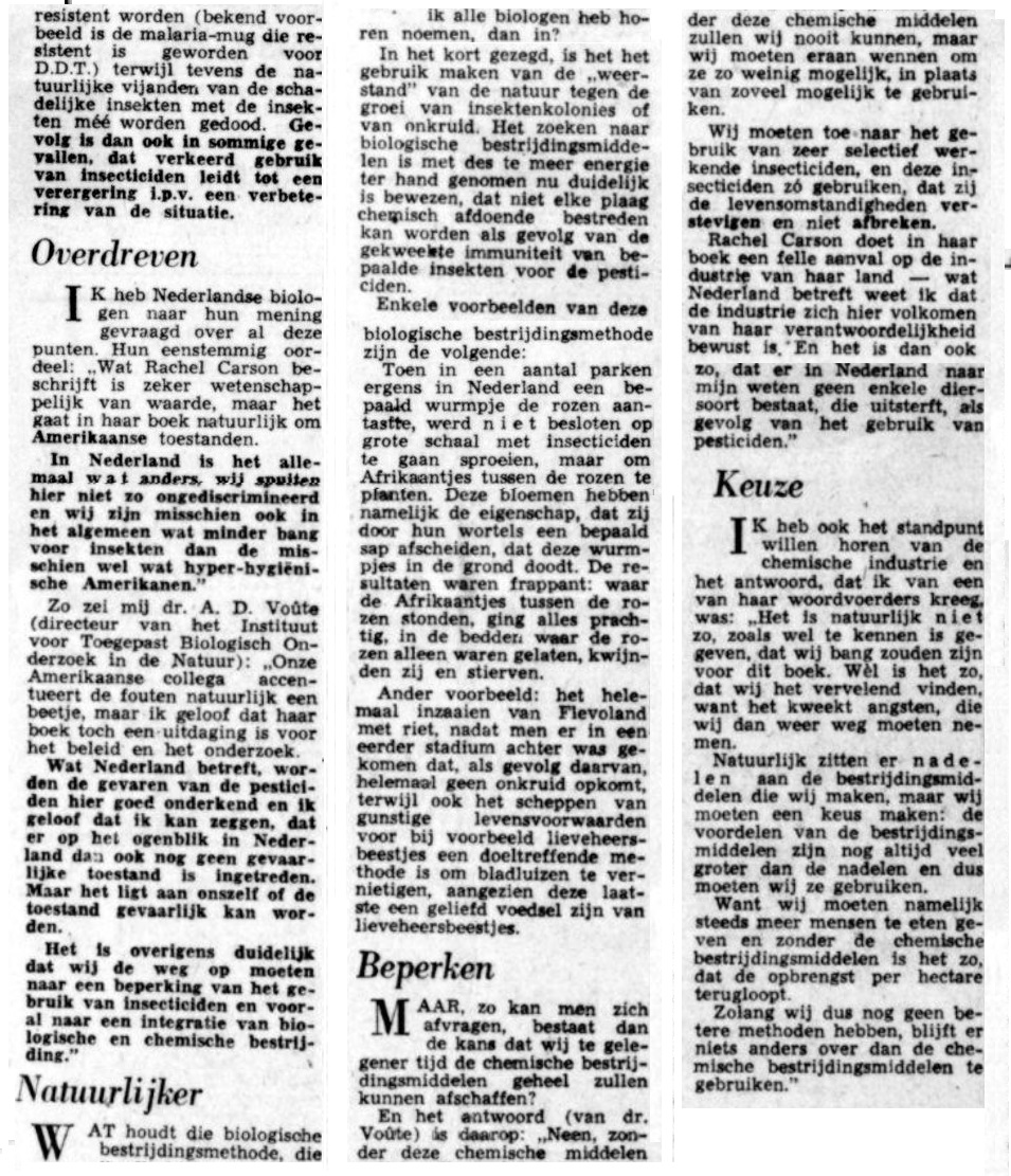 Rachel Carson doet in haar boek een felle aanval op de industrie van haar land — wat Nederland betreft weet ik dat de industrie zich hier volkomen van haar verantwoordelijkheid bewust is. En het is dan ook zo, dat er in Nederland naar mijn weten geen enkele diersoort bestaat, die uitsterft, als gevolg van het gebruik van pesticiden.”