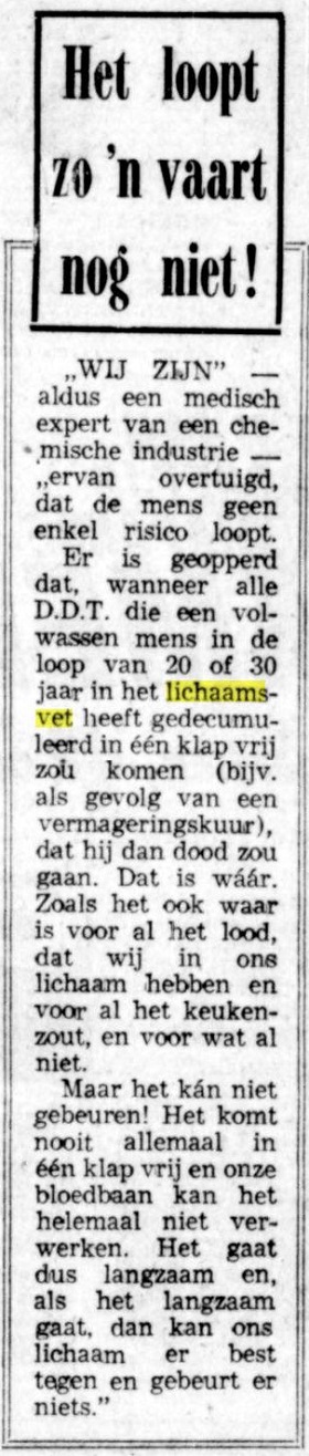 „WIJ ZIJN” — aldus een medisch expert van een chemische industrie „ervan overtuigd, dat de mens geen enkel risico loopt. Er is geopperd dat, wanneer alle D.D.T. die een volwassen mens in de loop van 20 of 30 jaar in het lichaamsvet heeft gedecumuleerd in én klap vrij zou komen (bijv. als gevolg van een vermageringskuur), dat hij dan dood zou gaan. Dat is waar. Zoals het ook waar is voor al het lood, dat wij in ons lichaam hebben en voor al het keukenzout, en voor wat al niet.