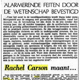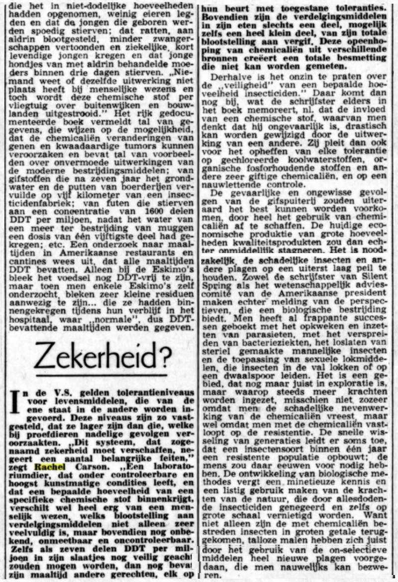 Een Amerikaanse biologe. Rachel Carson, heeft de V.S. vorig jaar opgeschrikt met een boek, waarin zij een op tal van feiten steunend overzicht gaf van vergiftiging die de natuur en de mensheid met de dood bedreigt tengevolge van de oncontroleerbare werking van de chemische bestrijdingsmiddelen.