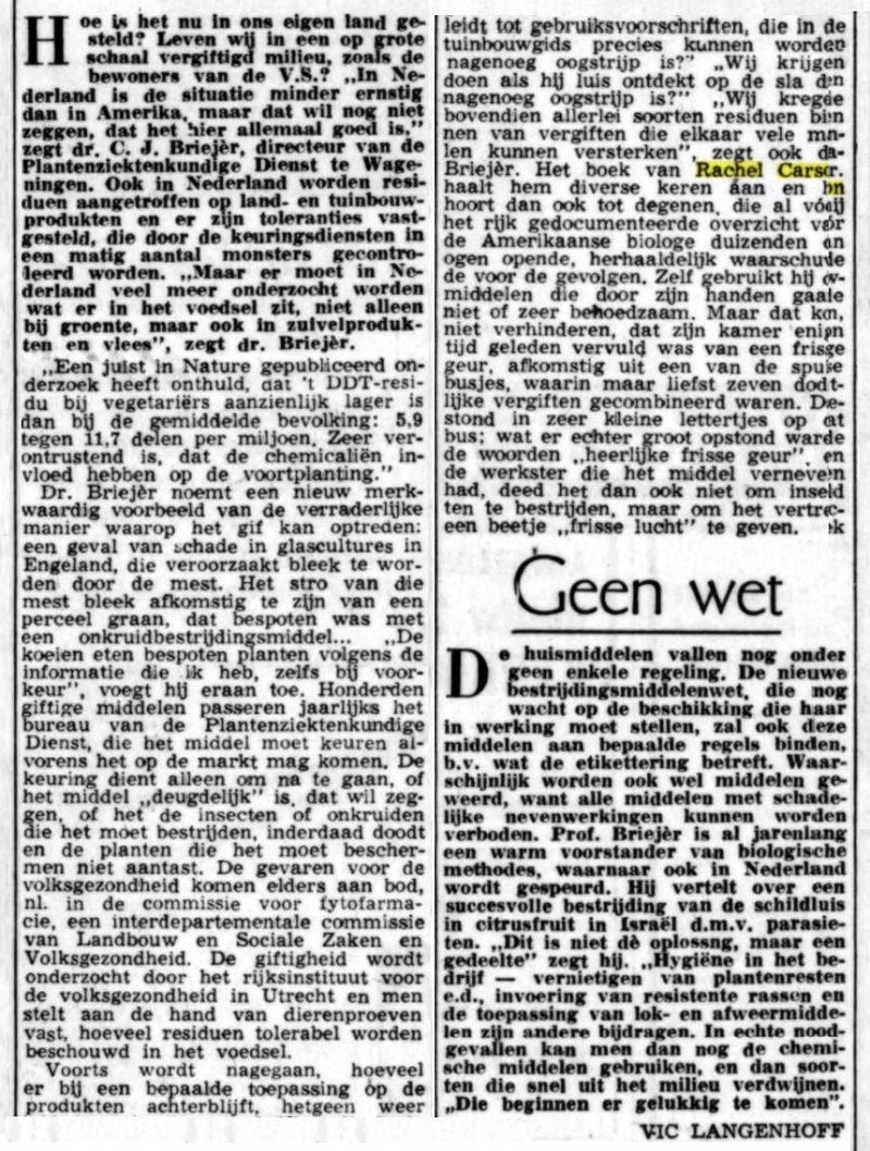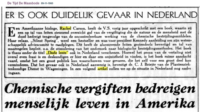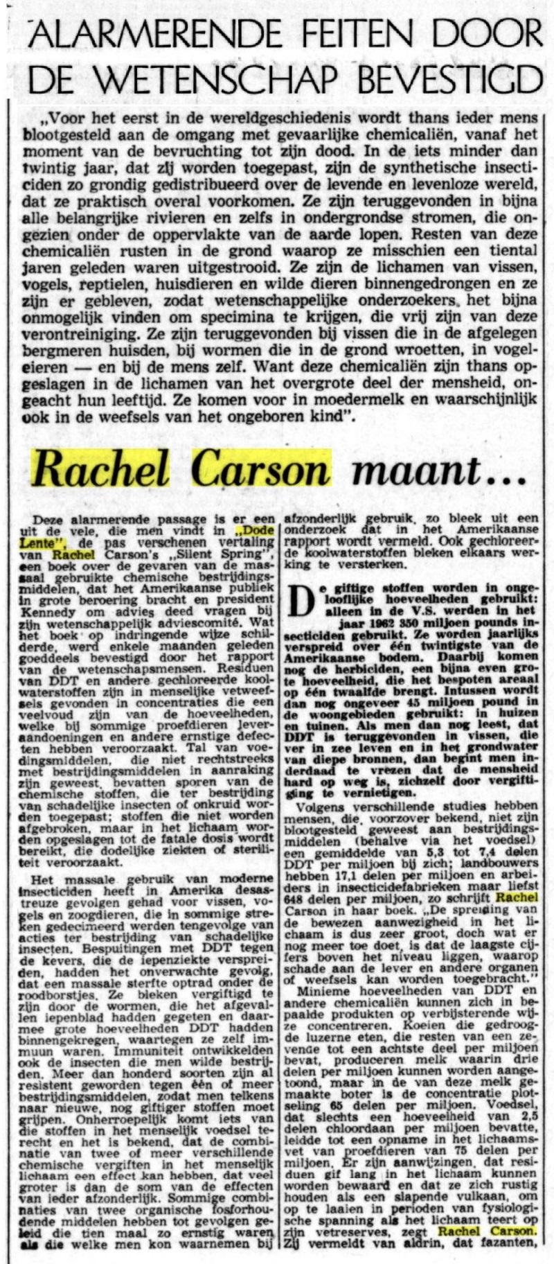 Haar relaas. „Silent Spring”, werd een bestseller en was voor president Kennedy aanleiding om zijn wetenschappelijk adviescomité te raadplegen. Dit heeft de alarmerende feiten grotendeels bevestigd en tal van maatregelen bepleit, o.a. de stimulering van het onderzoek naar biologische bestrijdingsmethodes. Het boek is thans onder de titel „Dode lente” ook in Nederland verschenen. Hoewel het proza van de vertaling niet overal even fraai is en deskundigen er hier en daar een onjuistheid in vinden, is het boek ruime aandacht waard, omdat het een groot publiek kan waarschuwen voor gevaren, die het zelf voor een groot deel kan verminderen. Dat het gevaar ook in Nederland aanwezig is, bevestigt dr. C. J. Briejèr van de Plantenziektenkundigen Dienst in Wageningen. In een volgend artikel zullen we op de situatie in Nederland nog nader ingaan.
