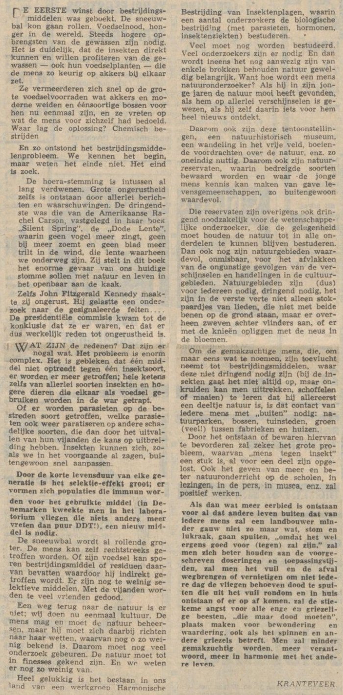 Het onderwerp waarmee onze medewerker Kranteveer zich in onderstaand artikel bezighoudt wordt op zeer uitvoerige wijze behandeld in het boek „Dode lente". Schrijfster daarvan is Rachel Carson. Zij is een Amerikaanse biologe die zich een wereldnaam heeft verworven met het prachtige boek „De wereldzee”. De oorspronkelijke editie van Rachel Carsons nieuwe boek heeft al onmiddellijk na verschijning opzien gebaard en opschudding verwekt. Want de feiten die de schrijfster daarin meedeelt en de verwachtingen voor de toekomst die ze erin openbaart zijn werkelijk alarmerend. De grootste risico's bestaan er vooralsnog in de Verenigde Staten waar de chemische insektenbestrijding een haast onvoorstelbare en ongelooflijke omvang heeft aangenomen.