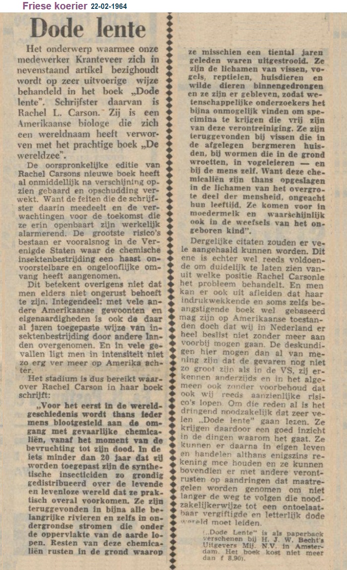 Dergelijke citaten zouden er vele aangehaald kunnen worden. Dit ene is echter wel reeds voldoende om duidelijk te laten zien vanuit welke positie Rachel Carson het probleem behandelt. En men kan er ook uit afleiden dat haar indrukwekkende en soms zelfs beangstigende boek wel gebaseerd mag zijn op Amerikaanse toestanden doch dat wij in Nederland er heel beslist niet zonder meer aan voorbij mogen gaan. De deskundigen hier mogen dan al van mening zijn dat de gevaren nog niet zo groot zijn als in de VS. zij erkennen anderzijds en in het algemeen ook zonder voorbehoud dat ook wij reeds aanzienlijke risico's lopen Om die reden al is het dringend noodzakelijk dat zeer velen “Dode lente” gaan lezen. Ze krijgen daardoor een goed inzicht in de dingen waarom het gaat. Ze kunnen er daarna in eigen leven en handelen althans enigszins rekening mee houden en ze kunnen bovendien er met andere verontrusten op aandringen dat maatre-gelen worden genomen om niet langer de weg te volgen die noodzakelijkerwijze tot een ontoelaatbaar vergiftigde en letterlijk dode wereld moet leiden.