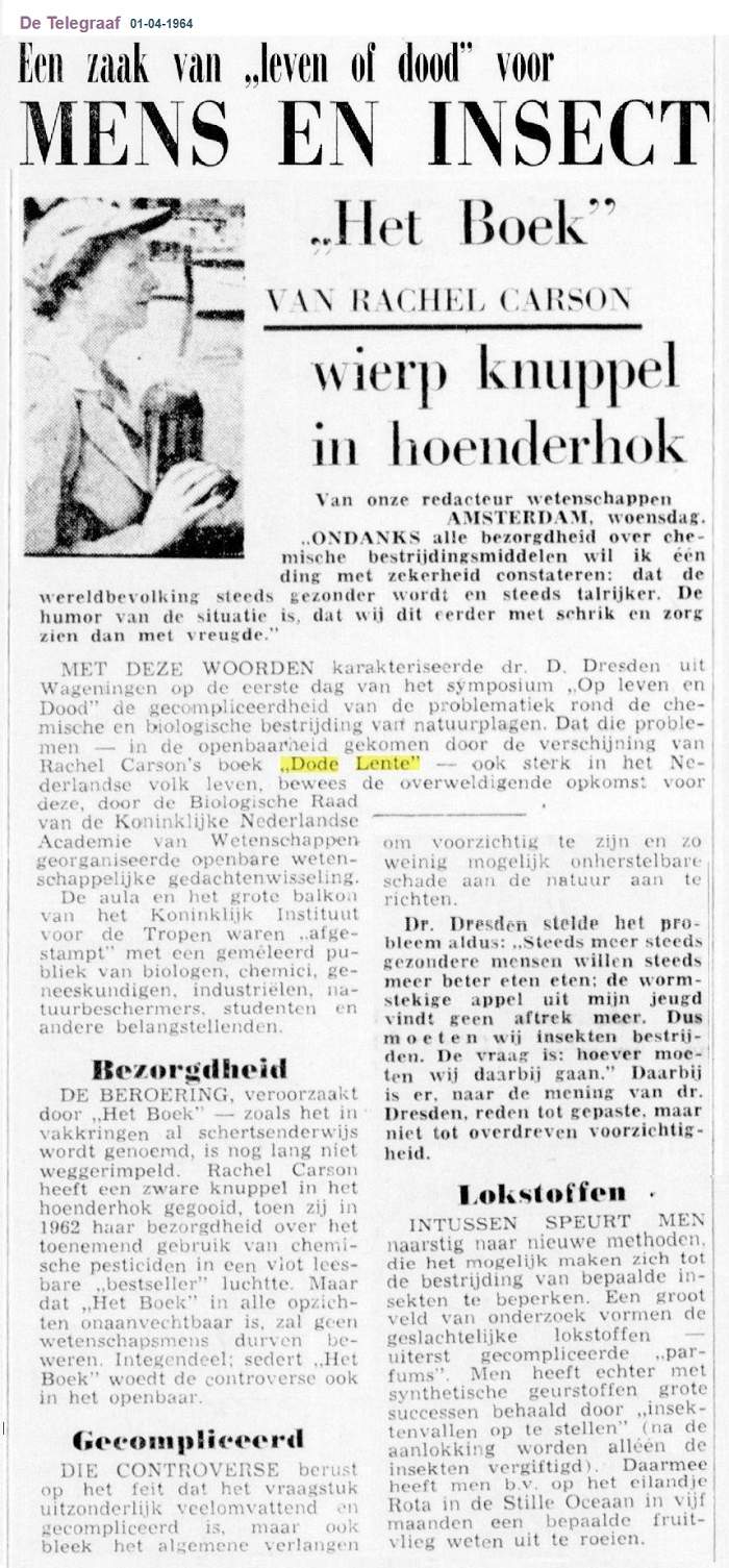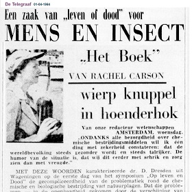 BRON: "Een zaak van „leven of dood" voor MENS EN INSECT „Het Boek" VAN RACHEL CARSON wierp knuppel in hoenderhok". "De Telegraaf". Amsterdam, 01-04-1964. Geraadpleegd op Delpher op 04-06-2019, https://resolver.kb.nl/resolve?urn=ddd:110589835:mpeg21:a0271
