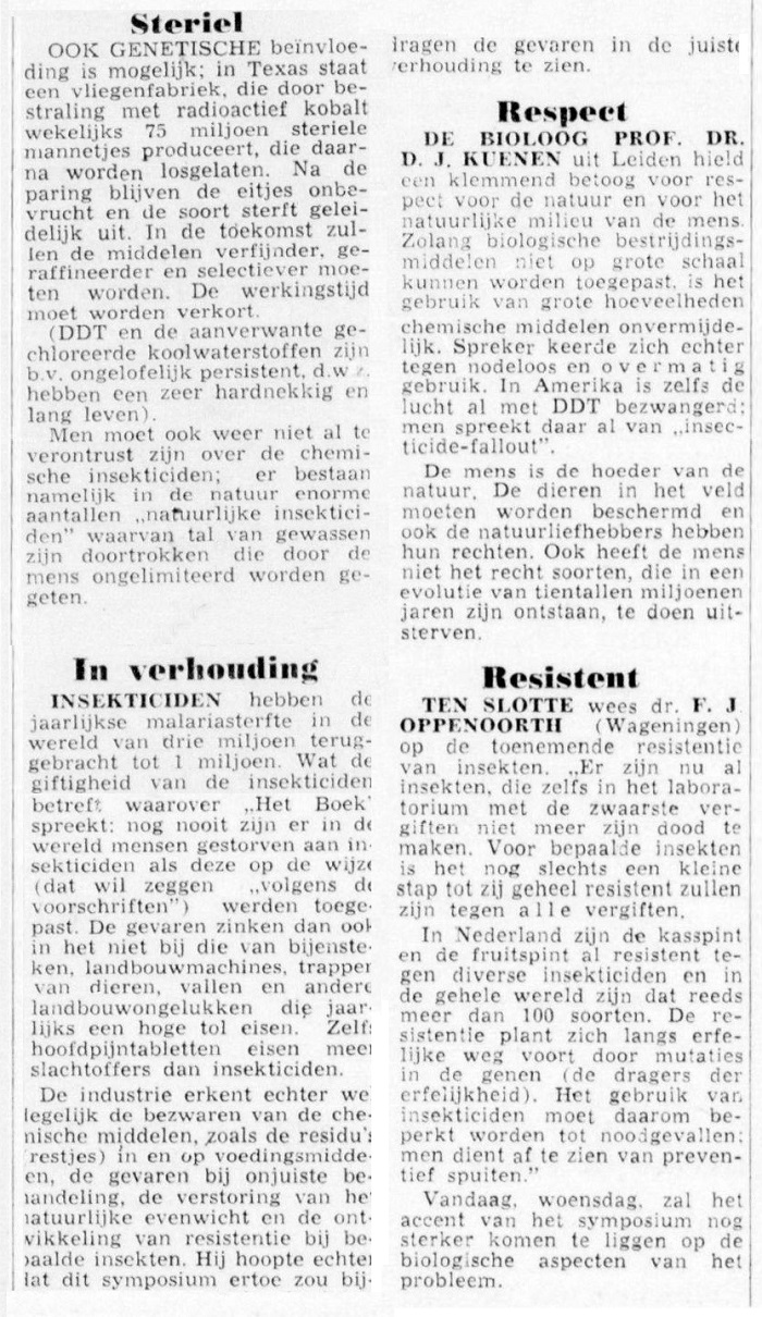 De bioloog prof. dr. D. J. Kuenen Leiden hield een klemmend betoog voor respect voor de natuur en voor het natuurlijke milieu van de mens. Zolang biologische bestrijdingsmiddelen niet op grote schaal kunnen worden toegepast, is het gebruik van grote hoeveelheden chemische middelen onvermijdelijk. Spreker keerde zich echter tegen nodeloos en overmatig gebruik. In Amerika is zelfs de lucht al met DDT bezwangerd: men spreekt daar al van „insecticide-fallout”. De mens is de hoeder van de natuur. De dieren in het veld moeten worden beschermd en ook de natuurliefhebbers hebben hun rechten. Ook heeft de mens niet het recht soorten, die in een evolutie van tientallen miljoenen jaren zijn ontstaan, te doen uitsterven.