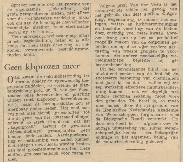 OOK kwam de onkruidbestrijding ter sprake. Zonder de tegenwoordig toegepaste middelen, zo vertelde de plantenfysioloog prof. dr. R. van der Veen, zouden onze korenvelden er prachtig uitzien (met klaprozen, korenbloemen e.d.), maar de korenproduktie zou er merkbaar onder leiden. Met veel succes past men hierbij ,, groeistoffen” toe die de groei van het (tweezaadlobbige) onkruid zo sterk stimuleren, dat het “kapotgroeit”, terwijl de gewenste (éénzaadlobbige) graanplanten geen hinder ondervinden.