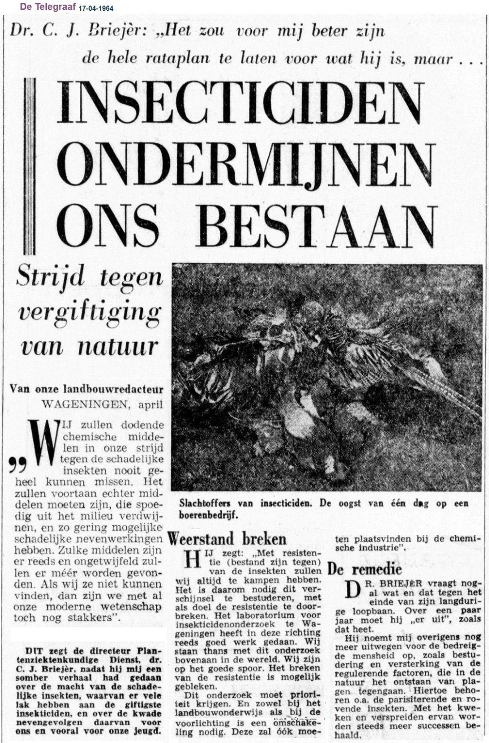 Dr. Briejèr zelf heeft stééds ernstig gewaarschuwd — ik herinner mij een gesprek met hem in 1954 — tegen de al te eenzijdige chemische bestrijdingsmiddelen. Hij wees met klem al jaren op biologische nadelen, die aan het gebruik daarvan zijn verbonden.