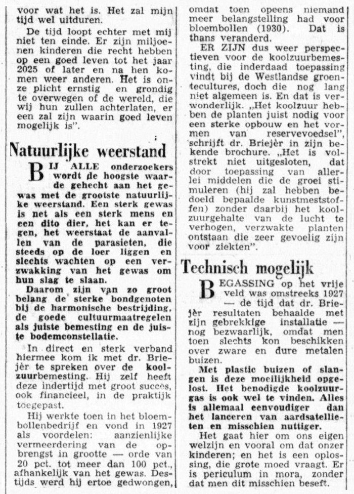 In direct en sterk verband hiermee kom ik met dr. Briejèr te spreken over de koolzuurbemesting. Hij zelf heeft deze indertijd met groot succes, ook financieel, in de praktijk toegepast.