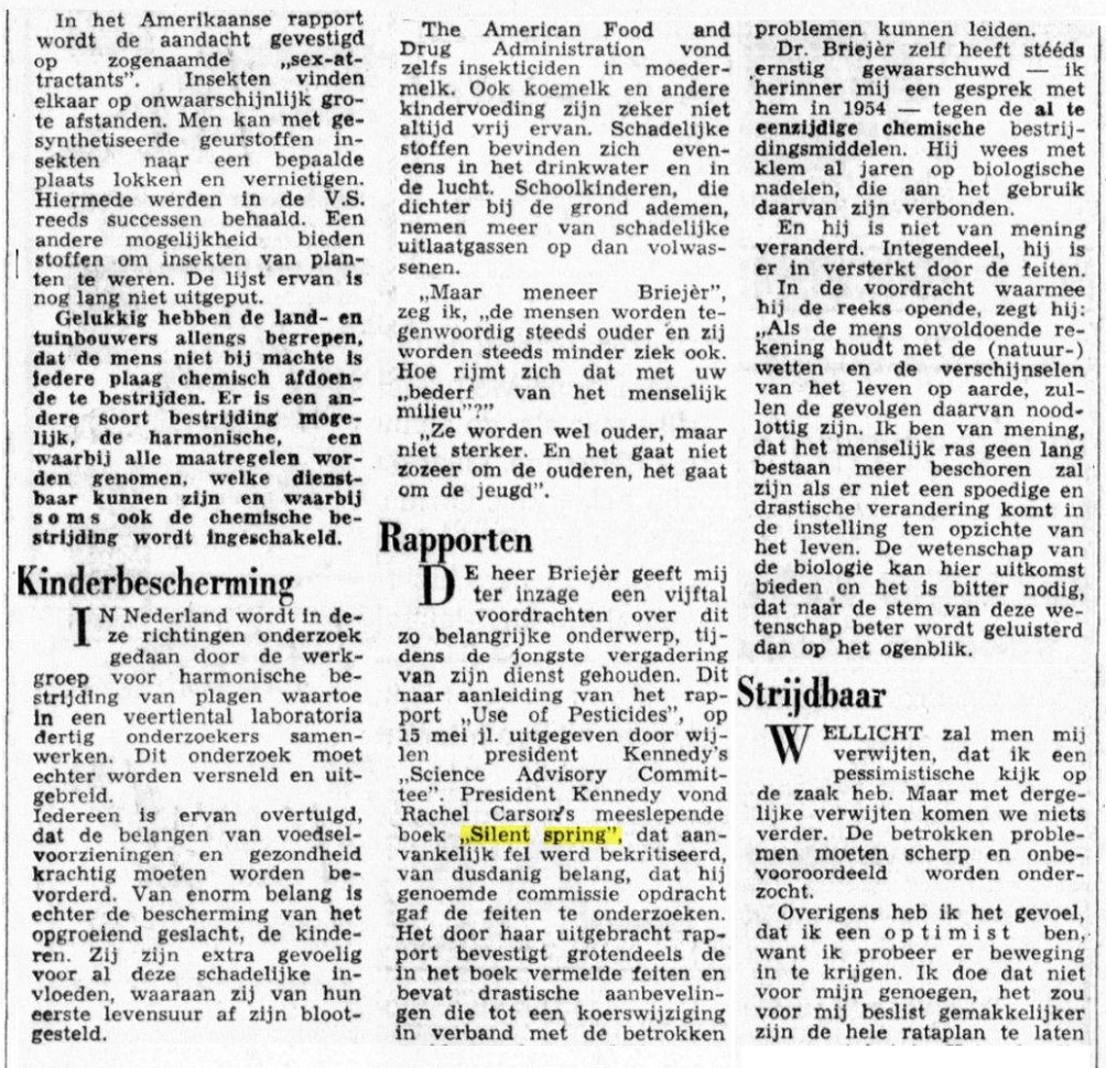 De heer Briejèr geeft mij ter inzage een vijftal voordrachten over dit zo belangrijke onderwerp, tijdens de jongste vergadering van zijn dienst gehouden. Dit naar aanleiding van het rapport „Use of Pesticides”, op 15 mei jl. uitgegeven door wijlen president Kennedy's „Science Advisory Committee”. President Kennedy vond Rachel Carson's meeslepende boek „Silent spring”, dat aanvankelijk fel werd bekritiseerd, van dusdanig belang, dat hij genoemde commissie opdracht gaf de feiten te onderzoeken. Het door haar uitgebracht rapport bevestigt grotendeels de in het boek vermelde feiten en bevat drastische aanbevelingen die tot een, koerswijziging in verband met de betrokken problemen kunnen leiden.