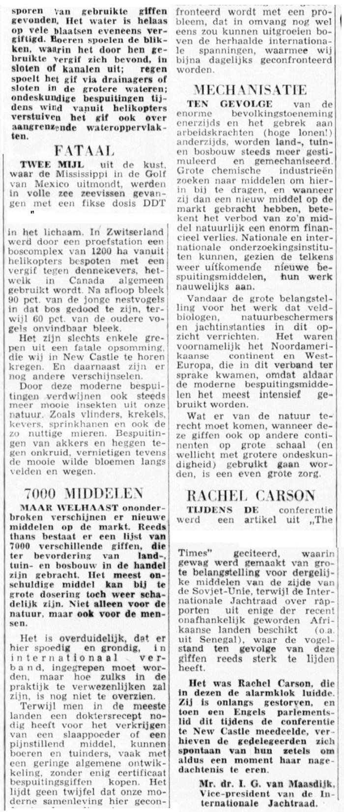 HET ZIJN echter niet alleen natuurbeschermers en jagers, die zich de laatste tijd ernstig bezorgd maken over het behoud van onze levende natuur. Ook prominente mannen van de wetenschap, die uitermate geïnteresseerd zijn in de uitwerking van de bespuitingsmiddelen op in de natuur levende dieren, in verband met hun eigen onderzoekingen omtrent de (fatale) invloed, die deze middelen ook op vee en mensen zouden kunnen hebben, woonden deze conferentie bij.