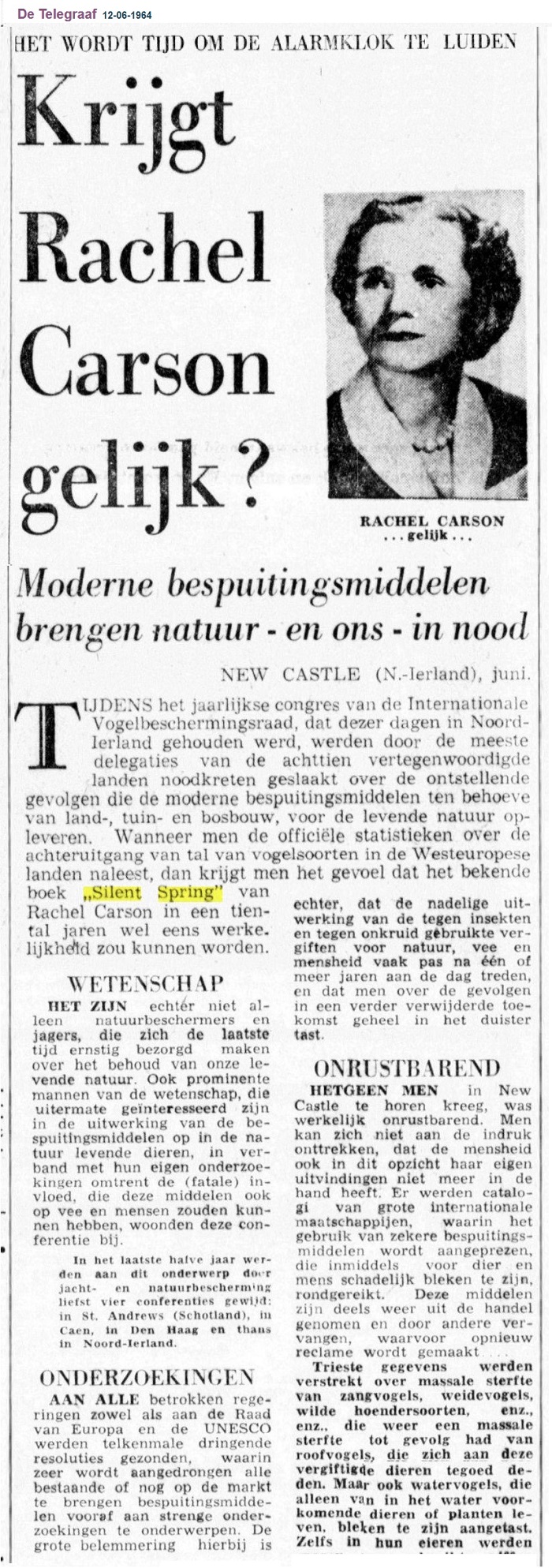 BRON: "HET WORDT TIJD OM DE ALARMKLOK TE LUIDEN Krijgt Rachel Carson gelijk? Moderne bespuitingsmiddelen brengen natuur – en ons – in nood