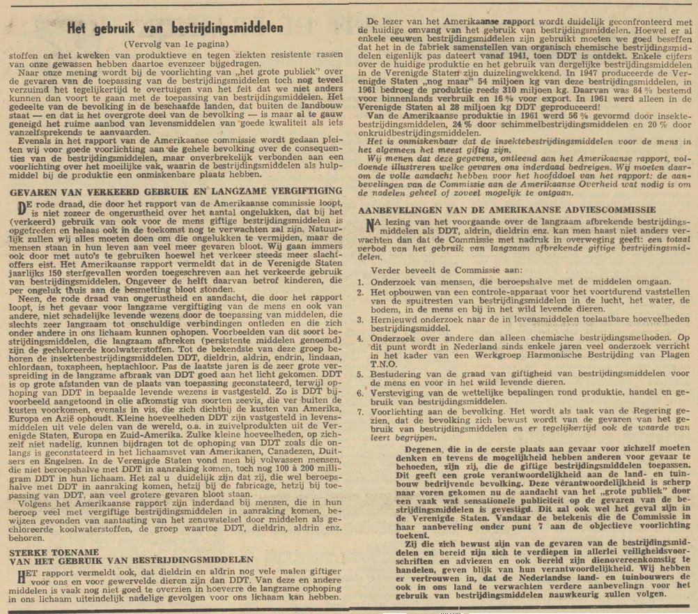 Evenals in het rapport van de Amerikaanse commissie wordt gedaan pleiten wij voor goede voorlichting aan -de gehele bevolking over de consequenties van de bestrijdingsmiddelen, maar onverbrekelijk verbonden aan een voorlichting over het moeilijke vak, waarin de bestrijdingsmiddelen als hulpmiddel bij de produktie een onmiskenbare plaats hebben.
