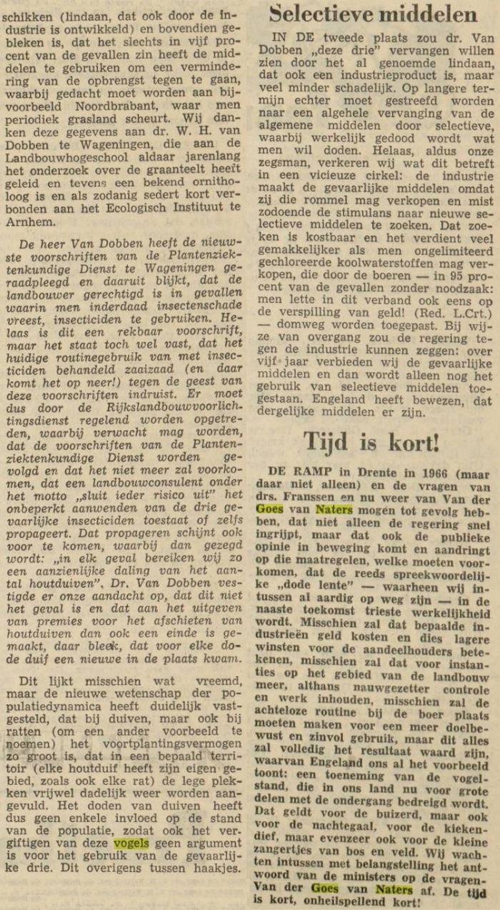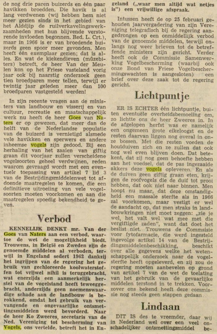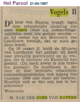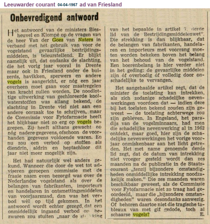 De Nederlandse regering gaat maatregelen nemen tegen de vergiftiging van vogels, die in 1965 bijvoorbeeld de populatie van buizerds heeft gehalveerd en verantwoordelijk is voor de sterfte van vele andere vogels. Dit blijkt uit het antwoord, dat minister Biesheuvel (Landbouw en Visserij), vandaag, mede namens mej. Klompé, minister van Cultuur, Recreatie en Maatschappelijk Werk, heeft gegeven op schriftelijke vragen van het Tweede Kamerlid de heer Van der Goes van Naters (PvdA). Deze vogelsterfte wordt veroorzaakt door ontsmettingsmiddelen voor voorjaarszaad, nl. aldrin, dieldrin en heptachloor. Deze ontsmettingsmiddelen worden vooral in Drenthe toegepast, daarbuiten slechts incidenteel.