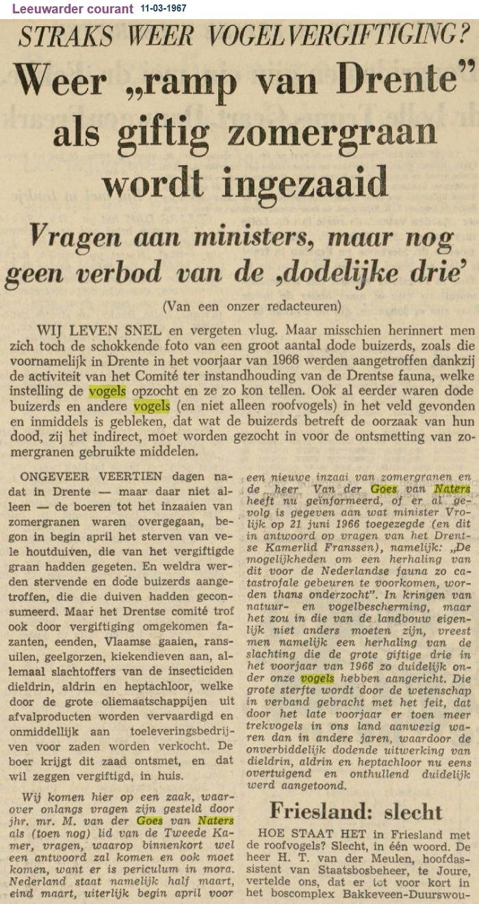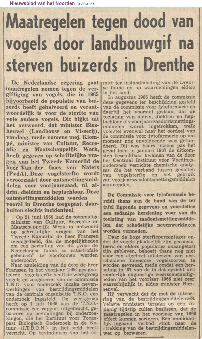 "Maatregelen tegen dood van vogels door landbouwgif na sterven buizerds in Drenthe". "Nieuwsblad van het Noorden". Groningen, 31-03-1967. Geraadpleegd op Delpher op 13-07-2019, https://resolver.kb.nl/resolve?urn=ddd:010870143:mpeg21:a0234