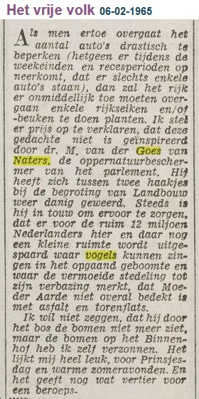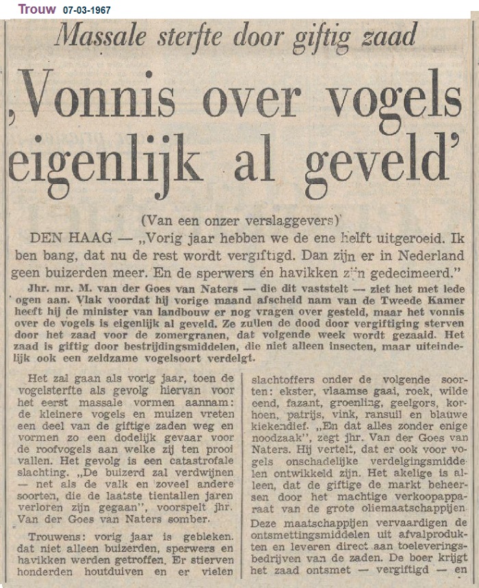 "Massale sterfte door giftig zaad ,Vonnis over vogels eigenlijk al geveld'". "Trouw". Meppel, 07-03-1967. Geraadpleegd op Delpher op 12-07-2019, https://resolver.kb.nl/resolve?urn=ABCDDD:010814813:mpeg21:a0159
